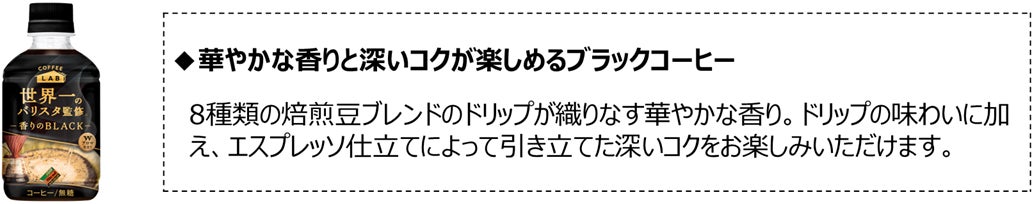 今年、発売から10年を迎えた「ダイドーブレンド 世界一のバリスタ監修」シリーズから発売するのは、コーヒーの知識と技術が卓越した世界一のバリスタが監修した、こだわりのW(ダブル)アロマ仕立てで、華やかな香りと深いコクが楽しめる微糖コーヒーとブラックコーヒーです。