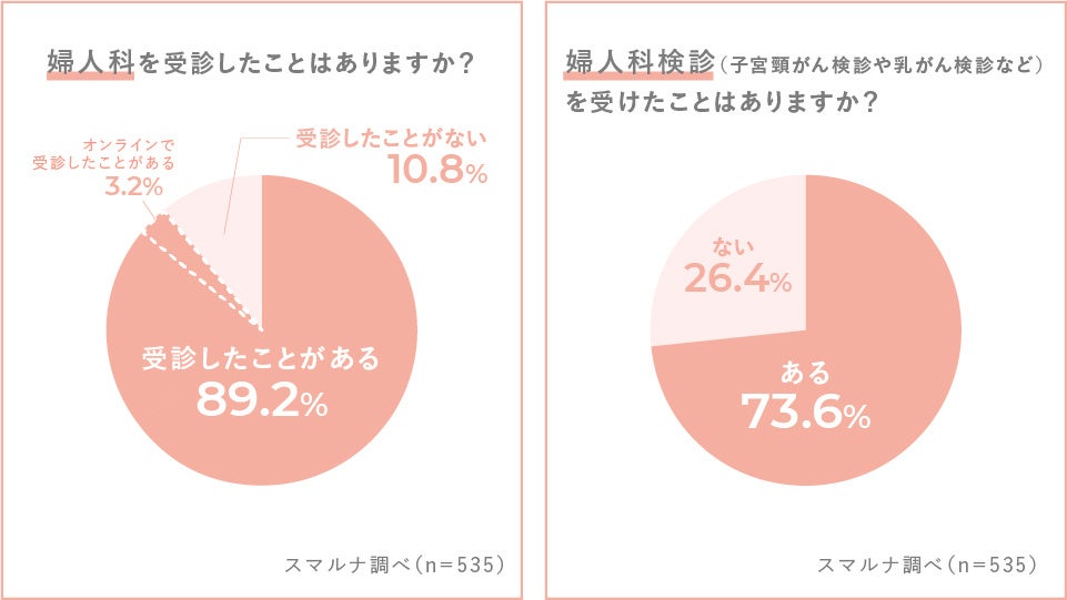 「婦人科を受診したことがある」と回答した人が89.2%で、そのうち「オンライン診察のみ受診をした」という人が3.2%と、企業が行ったグローバル調査における日本の女性の婦人科受診率(※1)と比較しても、スマルナユーザーは婦人科受診率が高いということがわかりました。また、婦人科検診(子宮頸がん検診や乳がん検診など)を受けたことがあると回答した人も73.6%と、婦人科検診率も高いという結果が出ています。