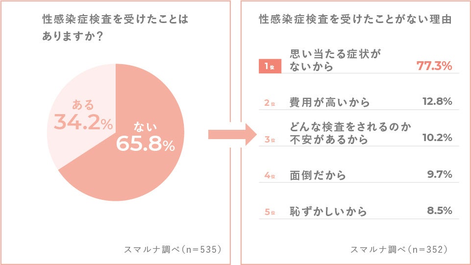 「性感染症検査を受けたことがない」と回答した人は65.8%で、受けたことがない理由としては「思い当たる症状がないから」77.3%と最も多い理由として選ばれました。