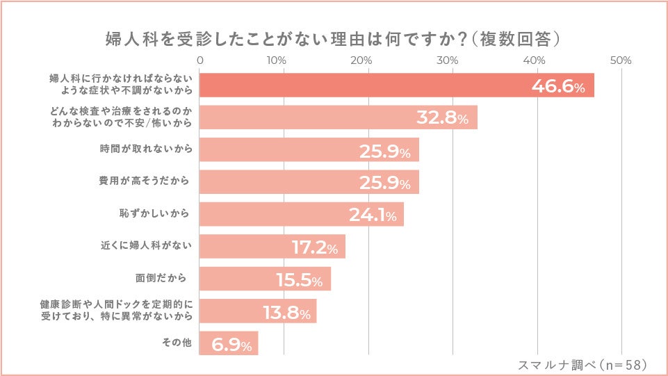 一方で、「婦人科を受診したことがない」と回答した10.8%の人に、その理由を聞いてみました。すると、「婦人科に行かなければならないような症状や不調がないから」が46.6%と最も多い理由として選ばれました。