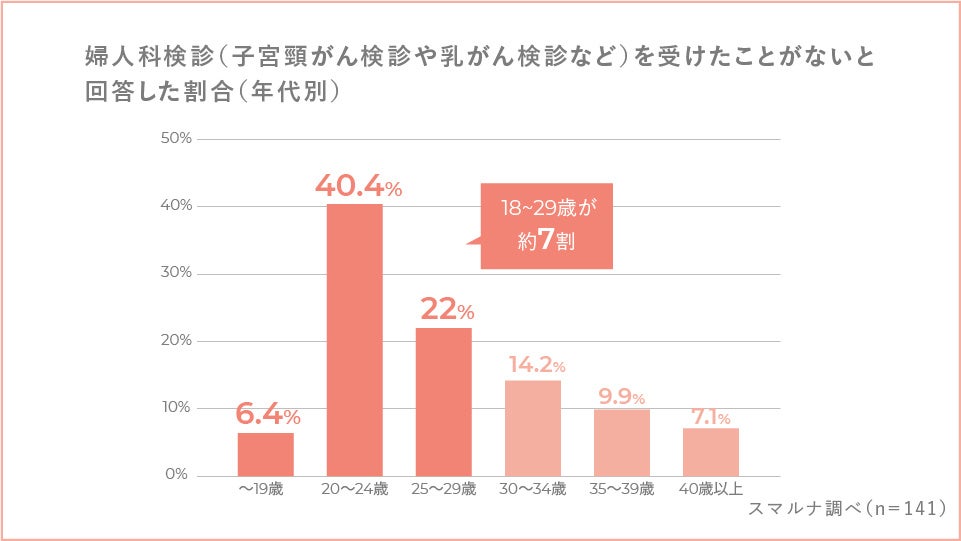 また、婦人科検診を受けたことがないと回答した人を年齢別でみてみると、18〜29歳が約7割と、若い世代の方の検診率が低いということがわかりました。