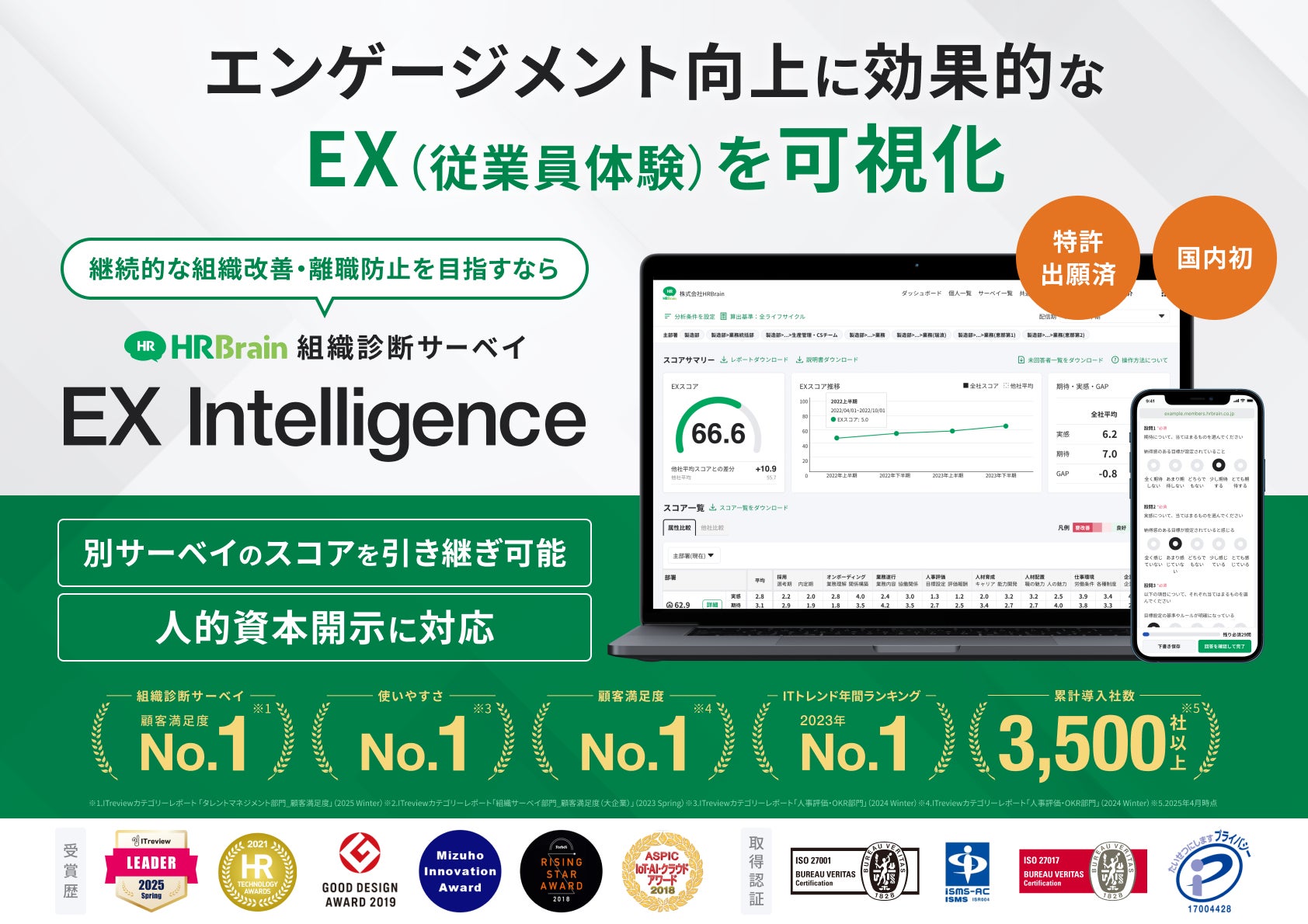 「EX Intelligence」は、従業員エンゲージメントを可視化するとともに、エンゲージメント向上のために必要な従業員体験(EX)を可視化し、具体的な組織課題の抽出を可能にするサーベイです。