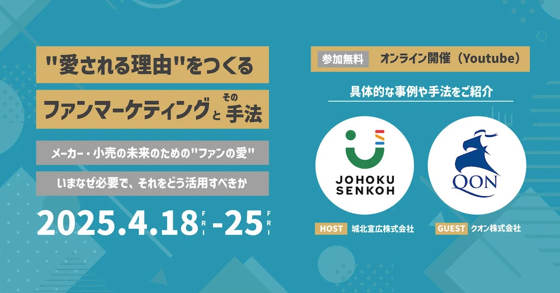 生活者の変化のキザシをとらえ、徹底的にエリアにこだわる“くらし・まちマーケティングⓇ”を掲げる城北宣広株式会社(本社:大阪市北区、代表取締役社長:大友 順)主催の無料ウェビナー「“愛される理由”をつくる ファンマーケティングとその手法」に、クオン株式会社(本社:東京都港区、代表取締役:武田隆)がゲスト登壇いたします。