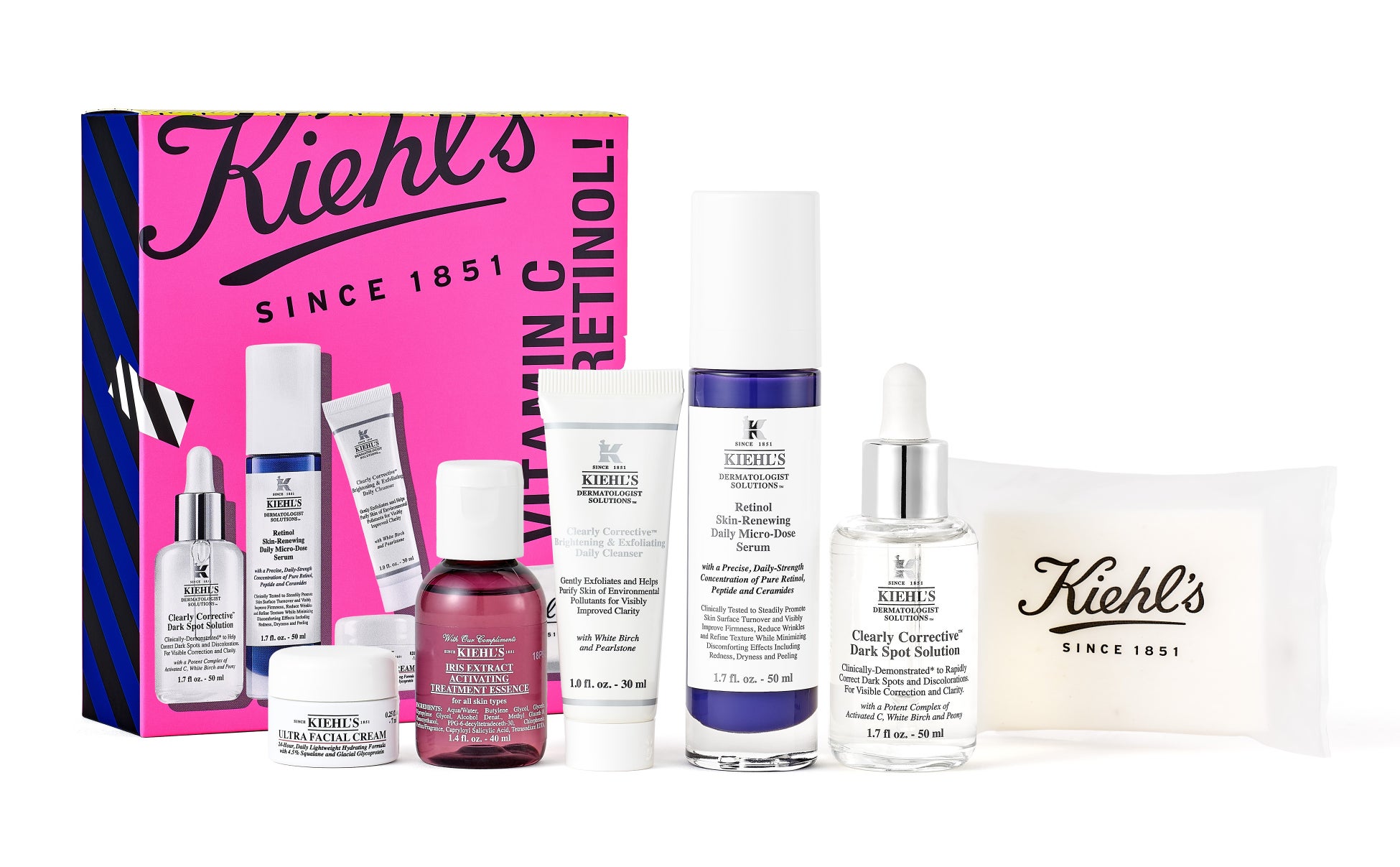 キールズの人気美容液である透明美白美容液とレチノール美容液、そしてこの2つと組み合わせて使うのにオススメなアイテムを組み合わせたスペシャルなセット。