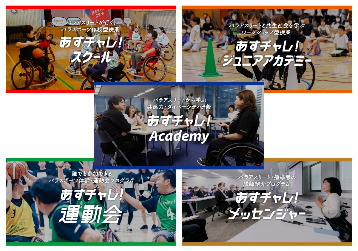 「あすチャレ!スクール」は、小・中・高・特別支援学校向けのパラアスリートから学ぶパラスポーツ体験型出前授業です。デモンストレーション、パラスポーツ体験、講話の3部から構成される90分間のプログラムで、パラスポーツを通じて児童生徒たちに共生社会への気づきや学びの機会を提供しています。車いすバスケットボール、車いす陸上、ゴールボールの3つのプログラムがあります。