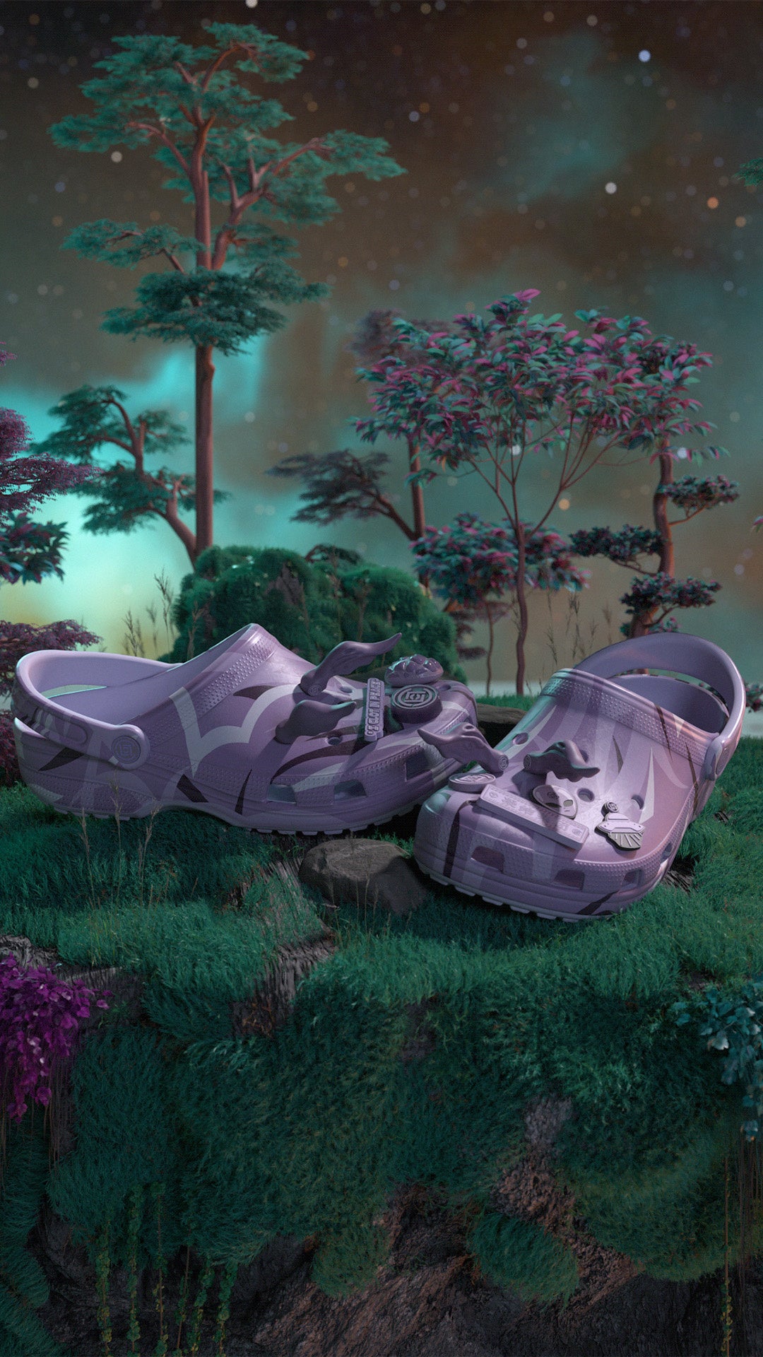 今回、クロックスを代表するモデルであるクラシッククロッグに、クロットの象徴的なデザインであるアリエネグラカモのグラフィックが施されたMauve mistとBlackの2色を用意しました。先の尖ったエイリアンの耳やUFO、そして香港発祥のパイナップルパンをデザインしたクロットならではのジビッツ™チャームが付属します。東洋と西洋のクリエイティビティが融合した1足をお楽しみください。