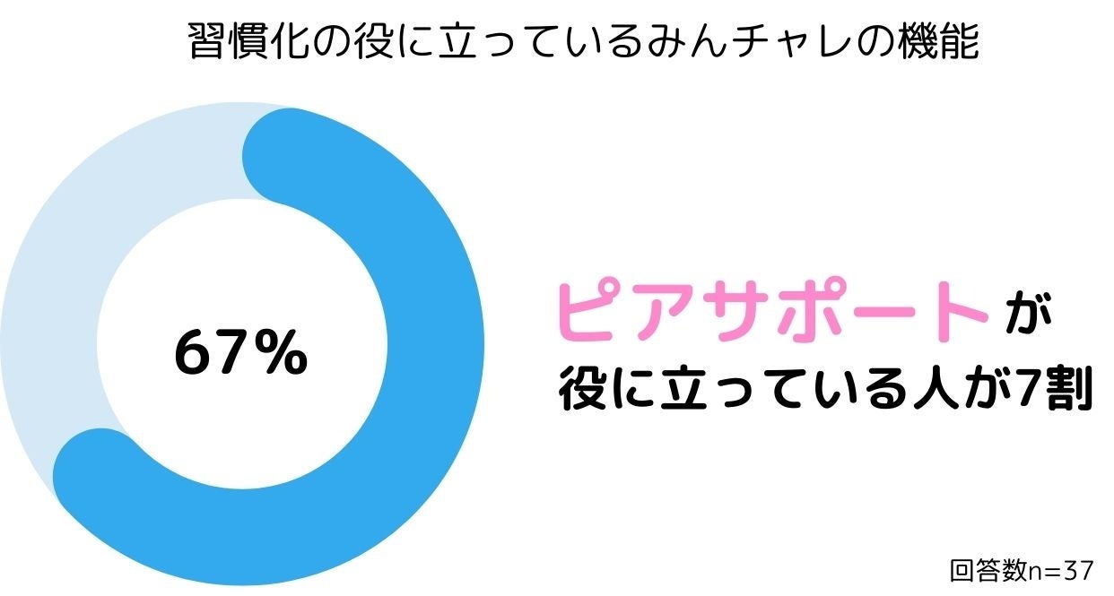 みんチャレには習慣化をサポートする多くの機能があり、その中でも、どんな機能が役に立っているか、選択肢の複数回答式で調査を実施しました。結果、一番回答として多かったのが「ピアサポート」で、全体の67%がこれを選びました。ついで、「写真で報告」が2位、3位は「最大5人のチーム制」「匿名性」となりました。
