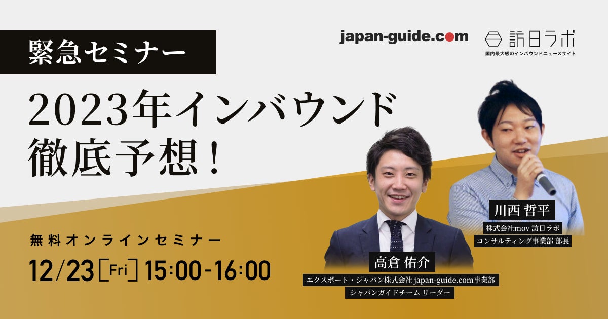 国内最大級のインバウンド総合メディア「訪日ラボ」を運営する株式会社mov(代表取締役:渡邊 誠、本社:東京都渋谷区、以下mov)は、世界最大級の英語訪日メディア「ジャパンガイド」との緊急セミナー「2023年のインバウンド徹底予想!」を開催します。