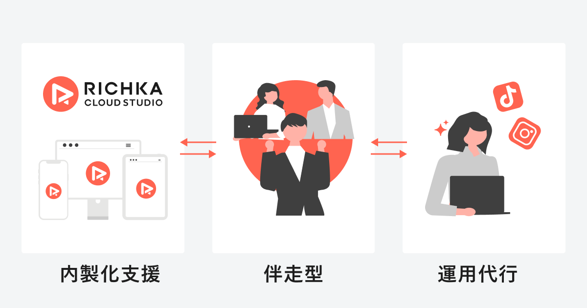 ノウハウが社内に溜まりづらい、ツール等を活用して内製化をするには作業負荷が大きすぎる等、SNS運用担当者の業務内容は複雑化しており、作業負荷が大きくなっています。そのような課題を解決するために内製化を支援しながら、業務負荷が大きい部分を中長期でサポートする “伴走型”の支援サービスを開発しました。