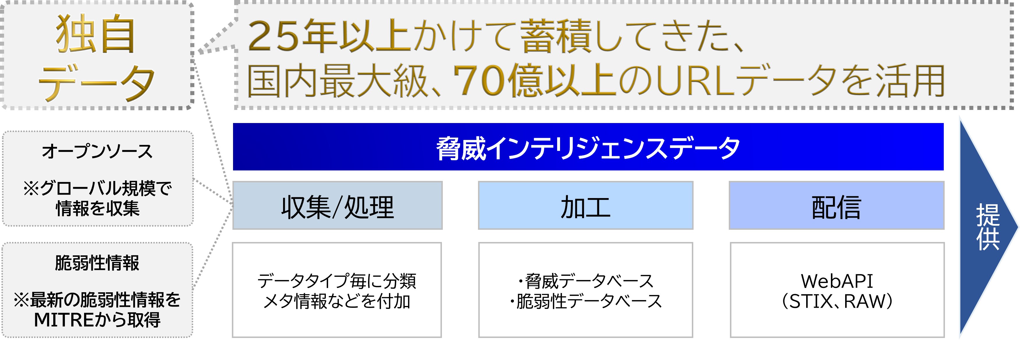 主なポイント | •70億以上のURLデータを含む独自データを活用して収集・処理した脅威インテリジェンスデータを提供 |