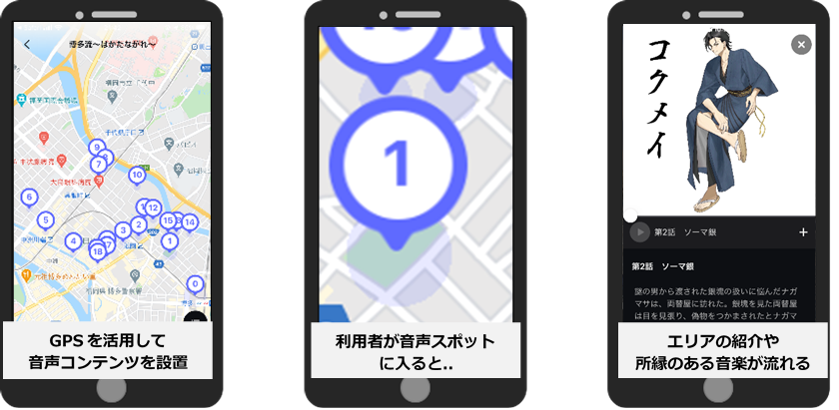 GPSやビーコン等を使い、特定の場所に紐づけた音声コンテンツを専用アプリから多言語で配信する仕組みです。美術館の音声ガイドを、アプリを使って街中に設置していく取り組みです。視覚に依存したARと異なり、利用者の歩きスマホを誘引しない高い安全性や、観光地や文化財などの景観を損なわないなど、音声+ARならではのメリットがあります。