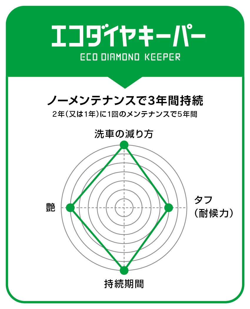 塗装面のツヤを損ねる微細キズや凸凹を「ガラス被膜」が埋めて平らにし、異次元のツヤを生むと同時に酸性雨や紫外線から塗装を守ります。さらに強固な「レジン被膜」で水シミなどが固着せず徹底的に塗装を守り※1、新車をも上回る美観を保ちます。