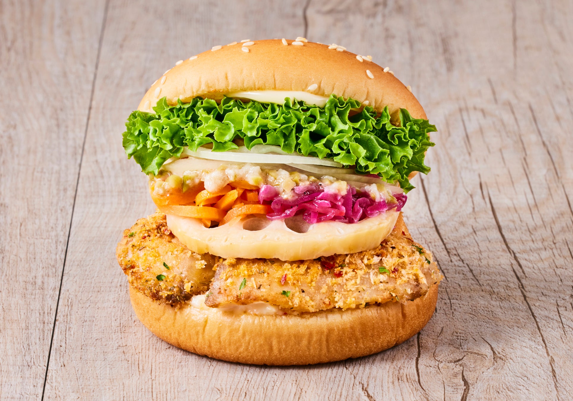 新商品「銀だらグリエのフレンチバーガー 彩り野菜とオリーブアンチョビソース」は、銀だらグリエに、プロヴァンス発祥のタプナードソース(オリーブとアンチョビのソース)をかけ、素揚げレンコンとキャロットラぺ、紫キャベツマリネの彩り野菜をトッピング。爽やかな酸味が特徴です。
