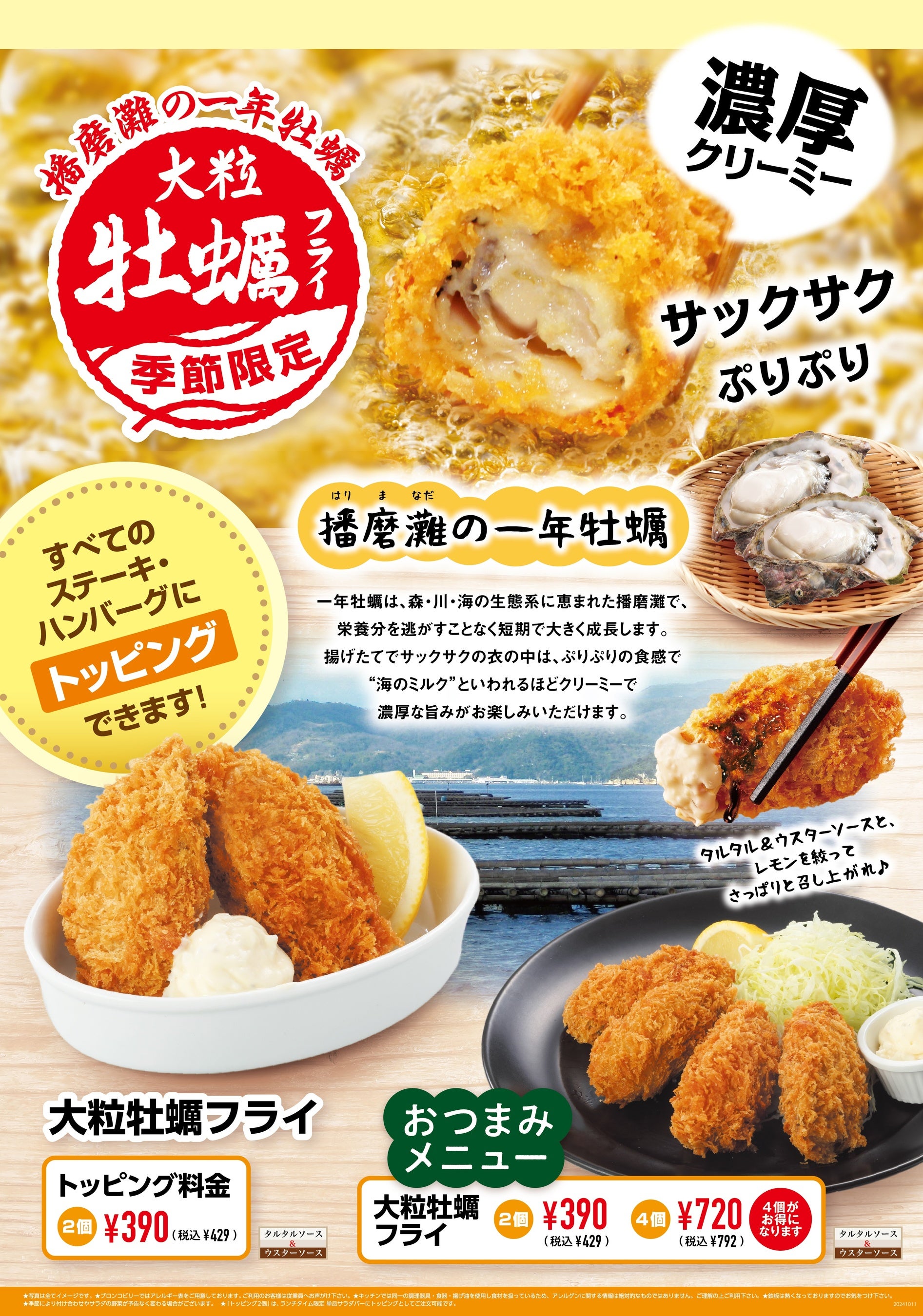 ステーキハウス ブロンコビリーを全139店舗展開する株式会社ブロンコビリー(本社:愛知県名古屋市 代表取締役社長:竹市 克弘)は、10月11日(金)より毎年大人気の秋冬メニュー、播磨灘の一年牡蠣『大粒牡蠣フライ』の提供を期間限定で開始します。また、人気の「バイヤーズセレクション」シリーズで好評のブランド牛、『炭焼きオーシャンビーフサーロイン』も同日より登場します。