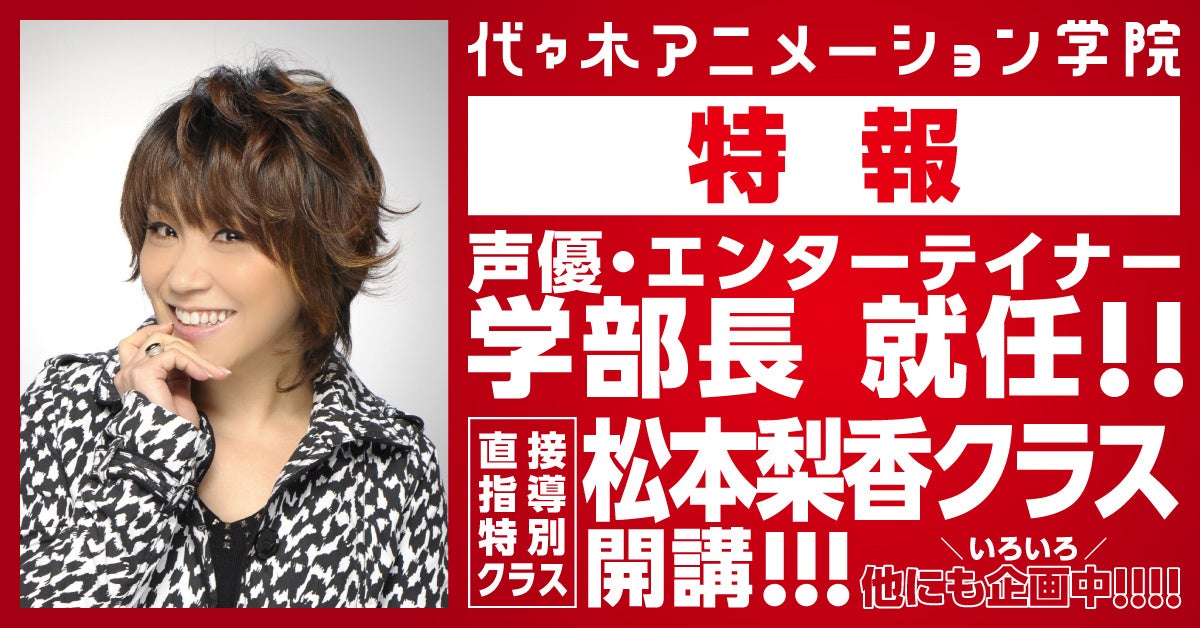 株式会社代々木アニメーション学院(本社:東京都千代田区神田三崎町1-3-9 代表取締役:橋本大輝)は、声優やタレント、アーティストなどを育てる「声優・エンターテイナー学部」の学部長に、マルチタレントの松本梨香さんが就任することが決定し、さらに、松本梨香さんが直接指導する特別クラス「松本梨香クラス」を開講することをお知らせいたします。