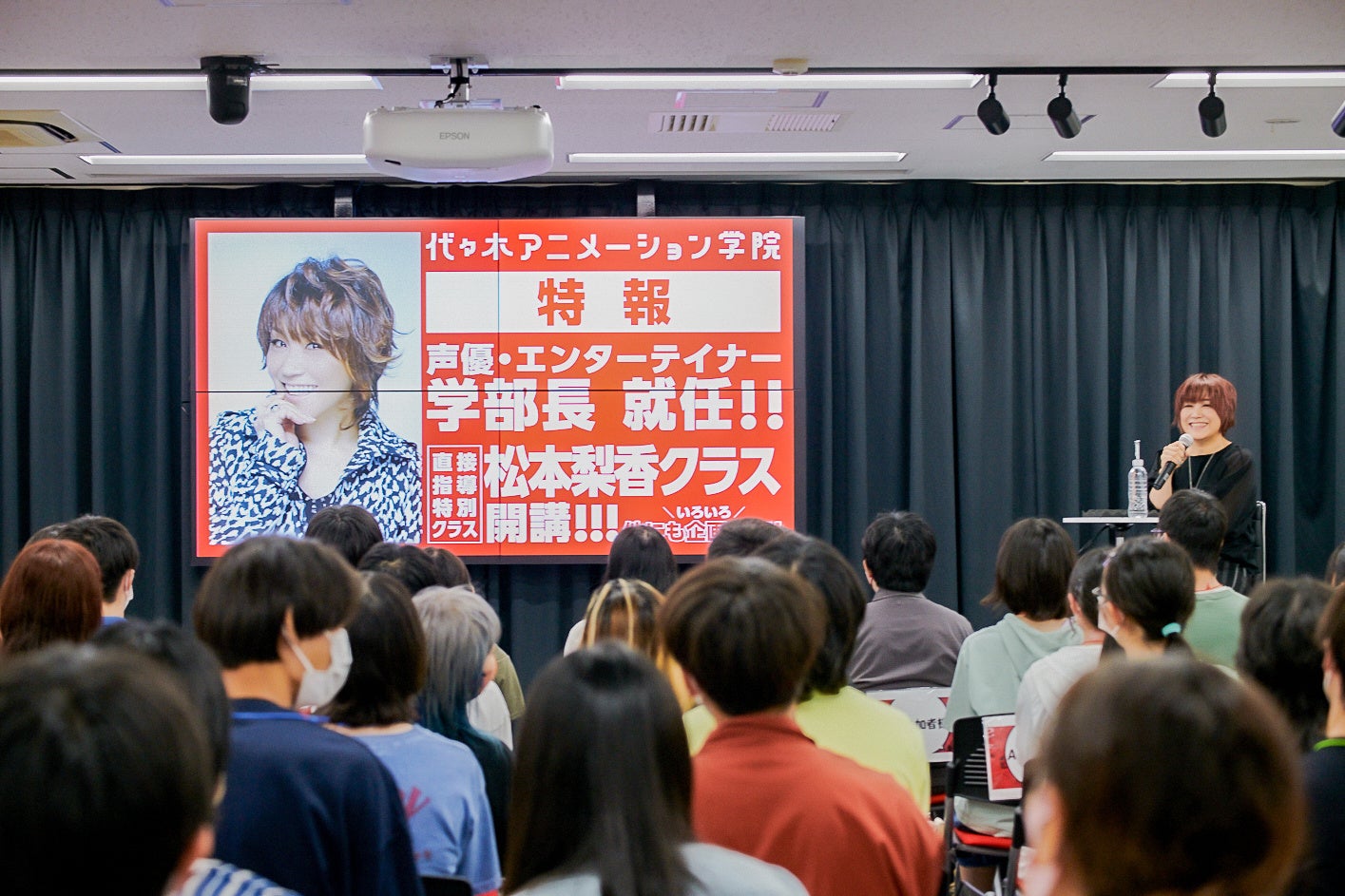 この声優・エンターテイナー学部長就任および「松本梨香クラス」開講のニュースは、8月27日、代々木アニメーション学院東京校にて開催した、松本梨香さんゲストオープンキャンパスにてサプライズ発表しました。会場には声優やエンターテインメント業界を目指す方が数多く集まっており、突然の発表に驚きの声が上がりました。