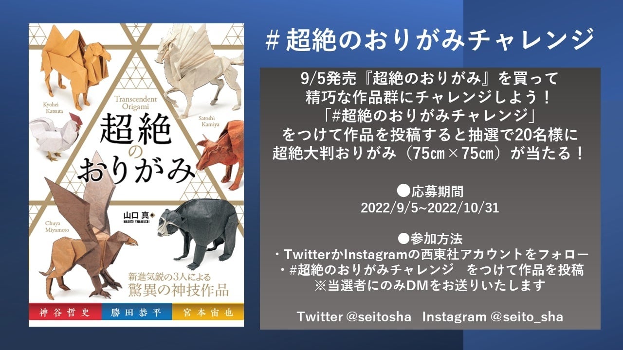 出版物の制作販売を行う株式会社西東社(東京都文京区、代表取締役:若松和紀)は、2022年9月5日、超高難度のおりがみ本『超絶のおりがみ』を発売します。おりがみ界のレジェンドである神谷哲史さん、勝田恭平さん、宮本宙也さんがそれぞれの世界観や特徴を作品を通して表現しており、折り図未発表の作品から、長い間ファンから親しまれてきた作品まで、全21作品を掲載しています。発売を記念して、TwitterとInstagramでは掲載作品を折って投稿すると超絶大判おりがみ(75㎝四方)が当たる「#超絶のおりがみチャレンジ キャンペーン」を実施します。
