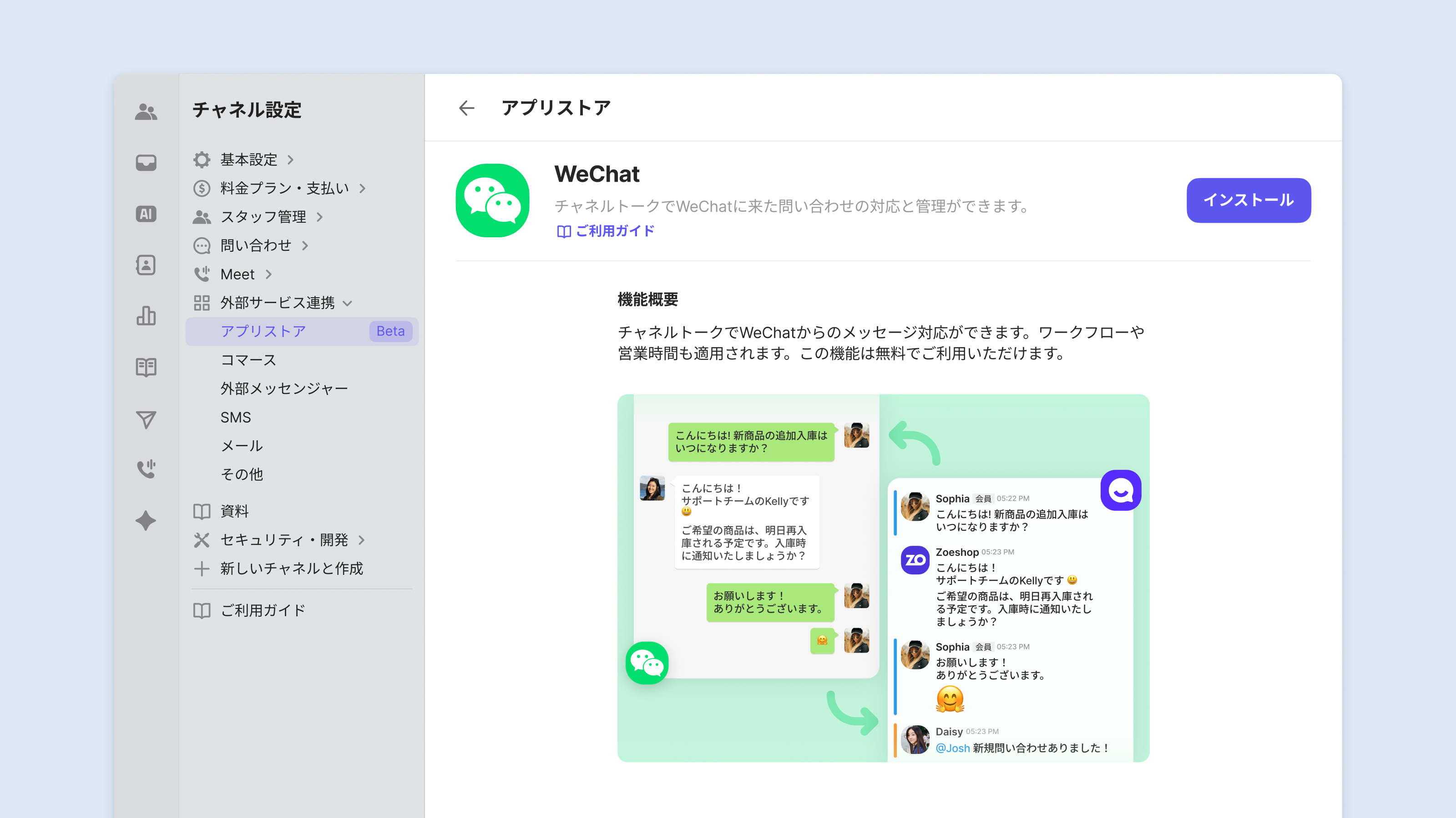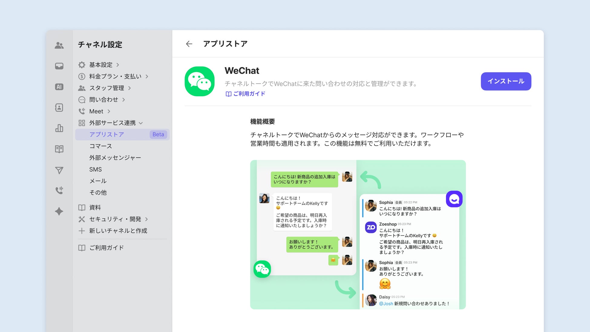 グローバル展開を支援する機能として、中国最大級のSNSであるWeChat公式アカウントとの連携を開始しました。これにより、海外顧客とのコミュニケーションを一元管理できる環境が整います。また、各国の祝日を踏まえた自動応答設定や、翻訳UIの改善により、多言語対応の実用性も向上しています。