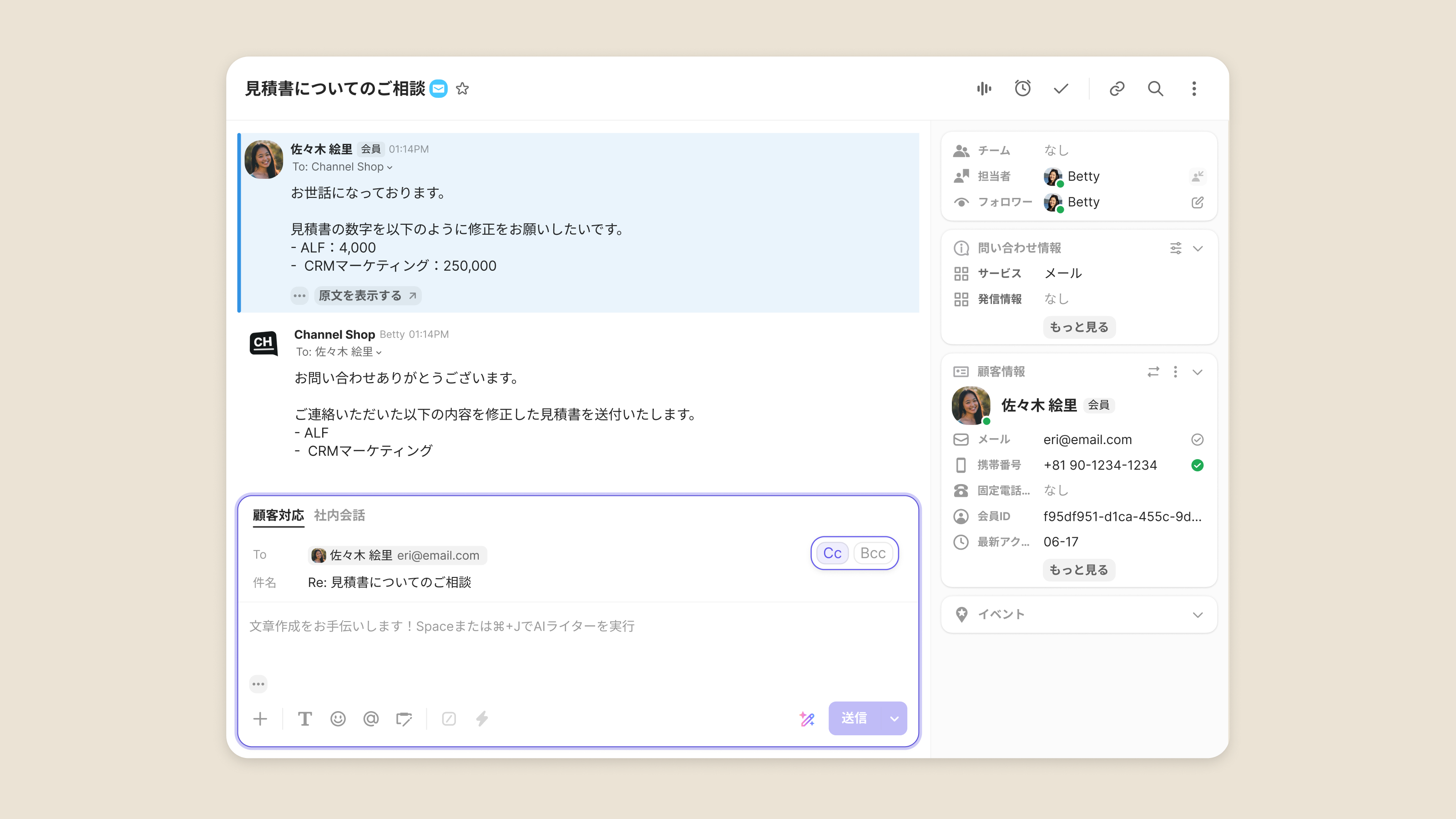 また、メールでの問い合わせについても機能を拡張し、これまで1対1に限られていたメール送信において、Cc/Bccを設定した複数人への送信が可能になりました。受信メールの件名編集にも対応したことで、BtoBにおける複雑なメール対応もチャネルトーク上で一元的に管理できるようになります。これにより、チャットとメールを横断した顧客対応の一貫性がさらに高まりました。