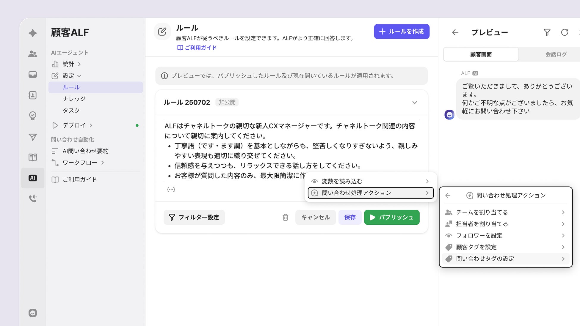 さらに、問い合わせ対応における処理フローをルールとして設定できるようになったことで、これまで人手に依存していた対応業務の自動化が進みます。応対の引き継ぎについても、顧客の行動実態に合わせた基準へと見直され、より現場に即した運用が可能になりました。