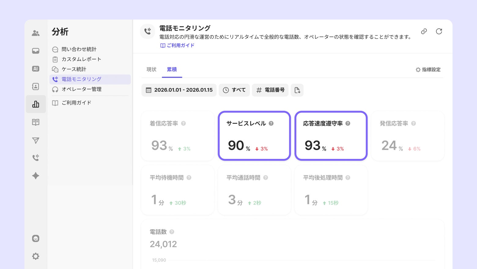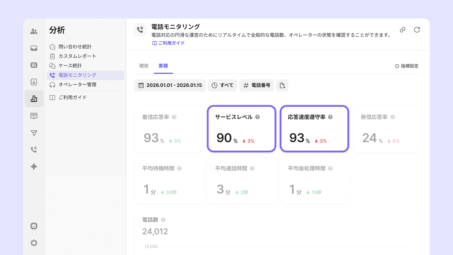 データ活用の面では、カスタムレポート機能の拡張により、企業ごとの意思決定に必要なデータを柔軟に可視化できるようになりました。さらに、電話応対におけるサービスレベルの測定基準を見直すことで、より実態に即したパフォーマンス評価が可能となっています。