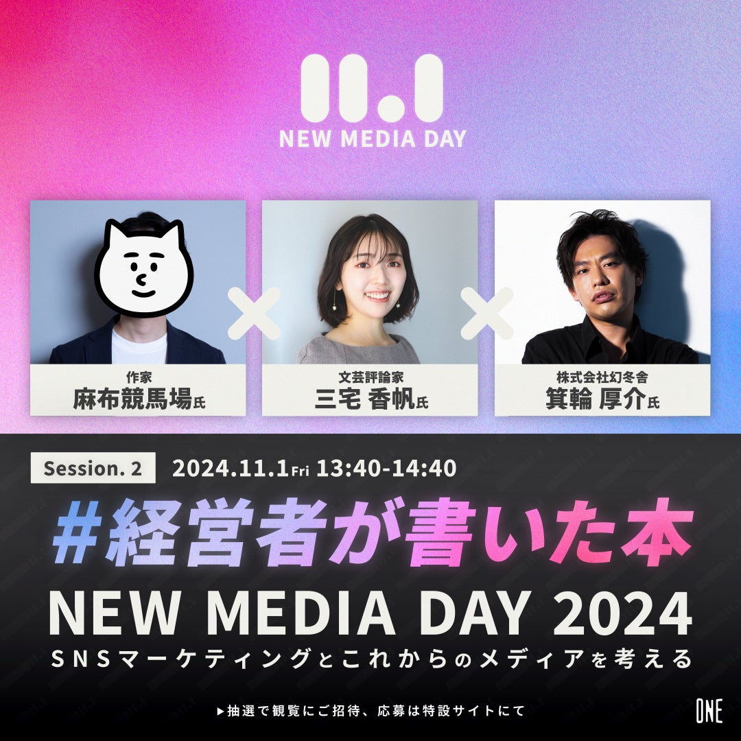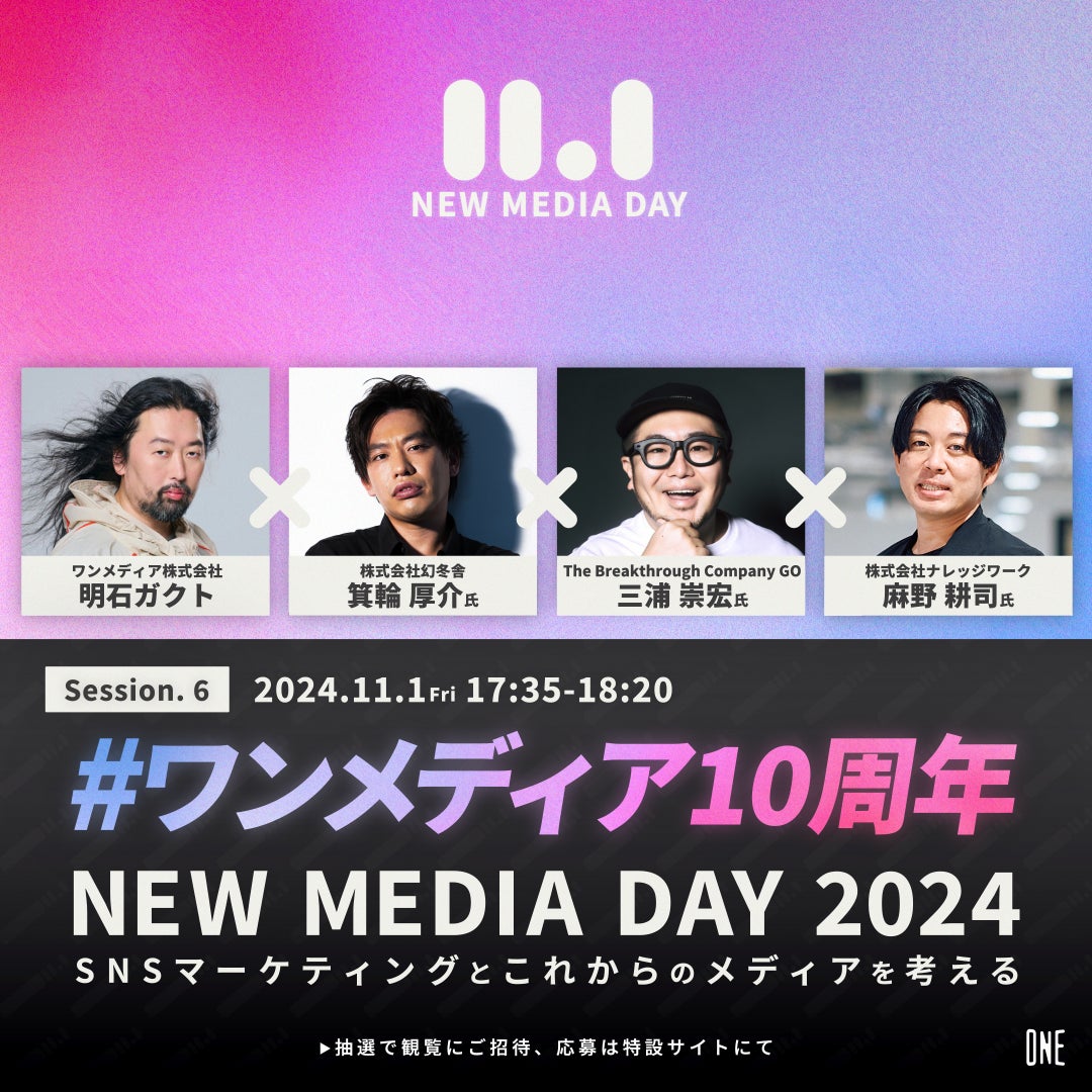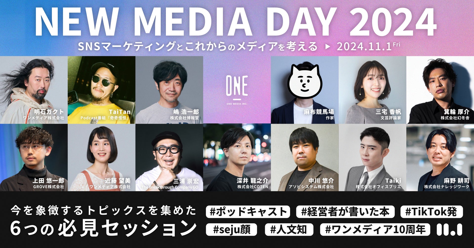 ワンメディア株式会社(本社所在地:東京都渋谷区、代表取締役CEO:明石ガクト、以下「ワンメディア」)は、従来のマスメディアとは異なるデジタル由来のメディア “ニューメディア” を推進するため、ワンメディア創業10周年の節目でもある本年の11月1日に、SNSマーケティングとこれからのメディアを考える完全招待型カンファレンス『NEW MEDIA DAY 2024』をWARP SHINJUKU(ワープ新宿、東京都新宿区)にて実施いたします。カンファレンスの開催に向け、すべてのセッションおよびスピーカーが決定いたしましたので、お知らせいたします。
