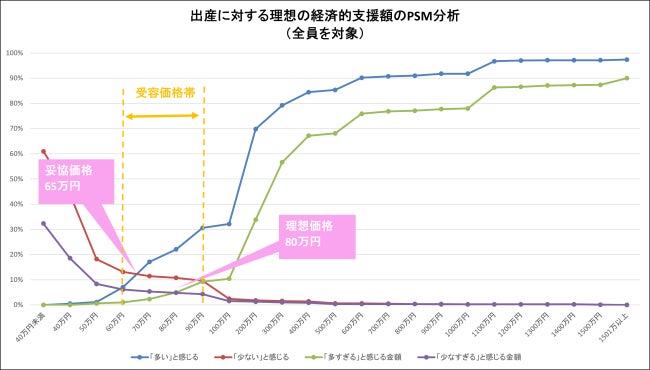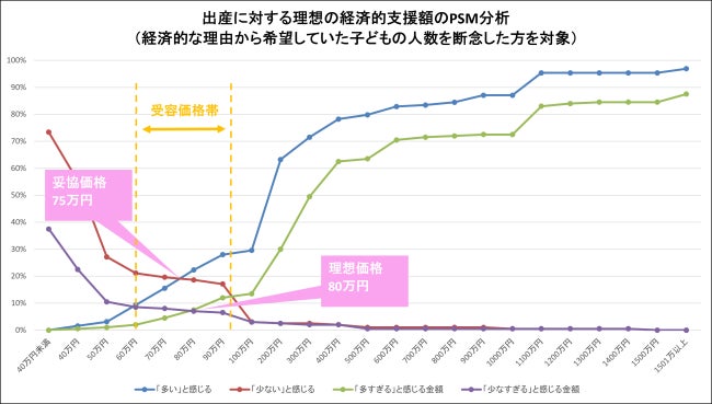 また、少子化支援を前提に1人の出産に対する支援額として、いくらでは多いと感じるか/少ないと感じるか/多すぎると感じるか/少なすぎると感じるかを尋ね、その回答をPSM分析したところ、子ども1人の出産に求める支援額の「妥協価格は75万円」「理想価格は80万円」であることが明らかになりました。