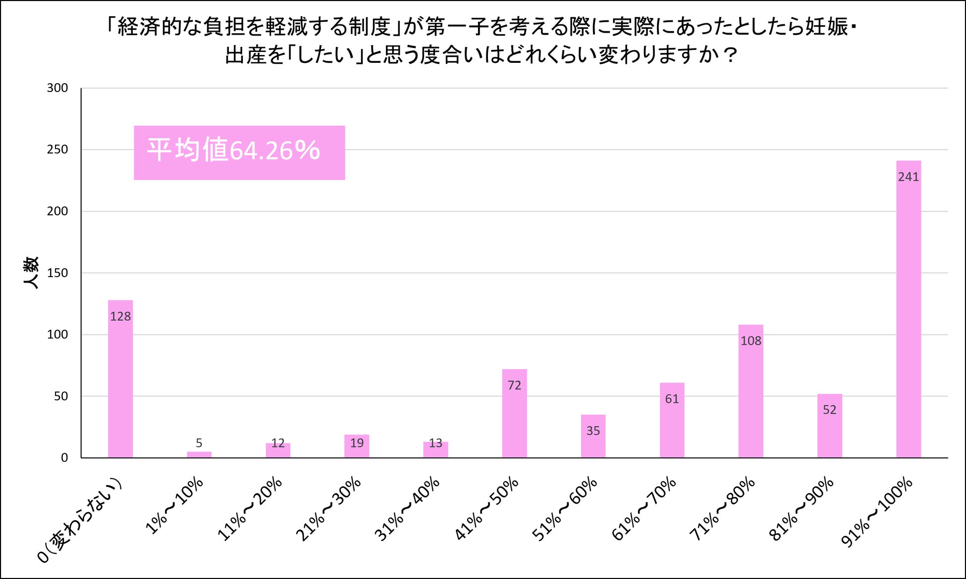 前段では、少子化支援を前提とした子ども1人の出産に対する理想の支援額80万円と、実際に子ども1人につき支給されている出産育児一時金42万円とを比較しましたが、出産育児一時金はあくまでも出産費用を補填するための支給金です。そこで、「経済的な負担を軽減する制度」が第1子を考える際に実際にあったとしたら、妊娠・出産を「したい」と思う度合いはどれほど変わったかを尋ねると、「約64%上昇する」という結果に。