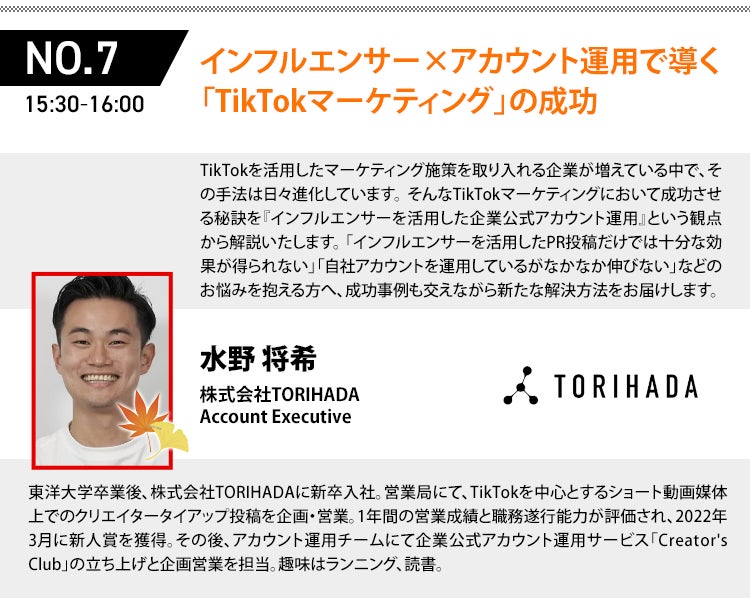 インフルエンサーを活用したショートムービーマーケティング事業を行う株式会社TORIHADA(本社:東京都渋谷区、代表取締役社長:若井 映亮)は、2024年10月9日(水)に開催される株式会社売れるネット広告社が主催するD2Cをテーマとしたカンファレンスに、株式会社ウィルゲート、株式会社 WUUZY、株式会社ダイレクトマーケティングゼロ、森永乳業株式会社、ソーシャルワイヤー株式会社、株式会社プラセス製薬とともに登壇いたします。