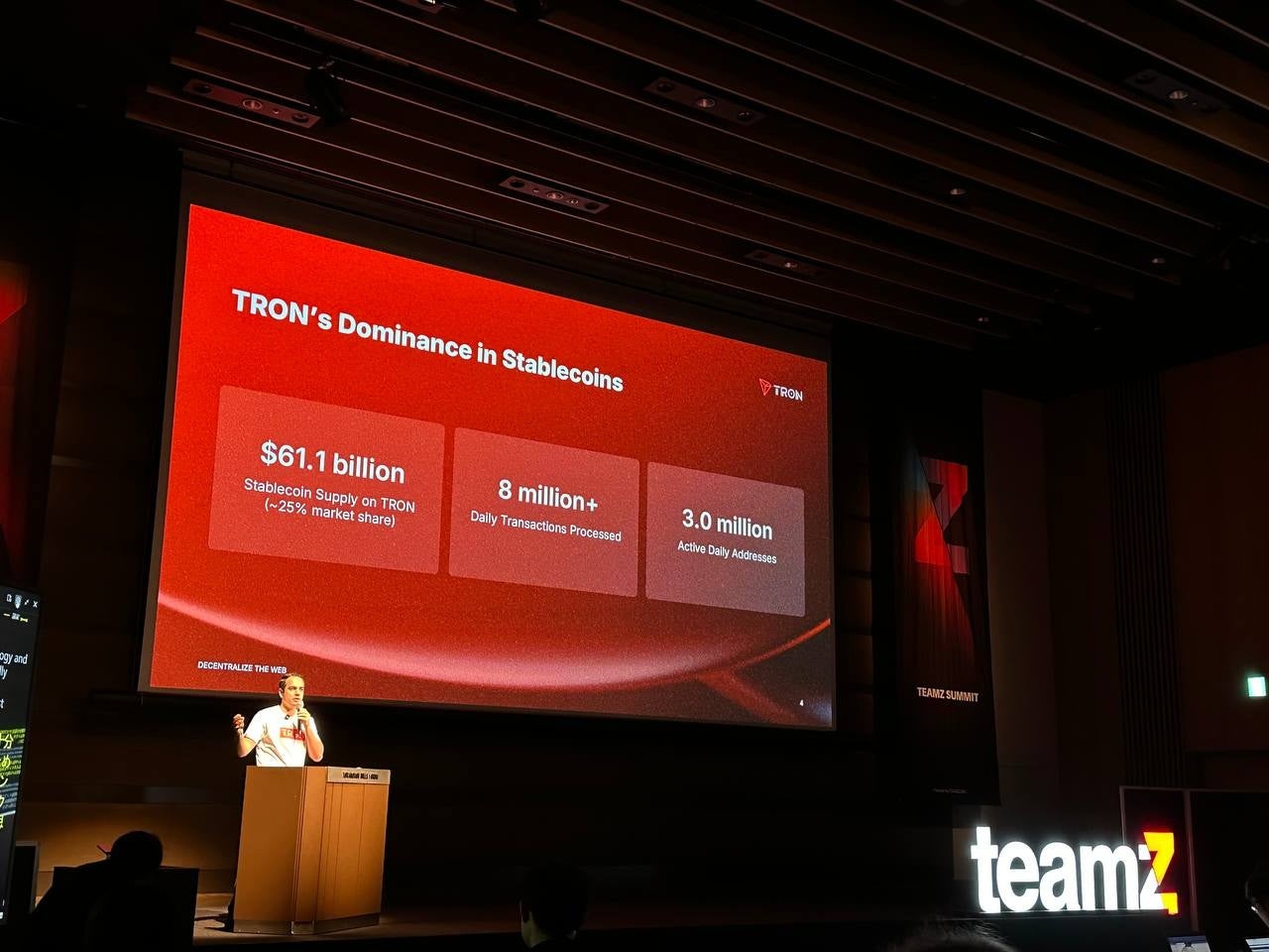 Tron DAOのコミュニティ代表であるSam Elfarra氏は、Tronが安価で高速なブロックチェーンとして、特にステーブルコインと決済領域で大きな存在感を示していることを紹介。Tronは日次取引件数が700~800万、ウォレット数は3億を超え、グローバルサウス(アフリカ、ラテンアメリカ、東南アジア)で活用が進む。特に経済インフラが整っていない地域において、低コストかつ即時決済が可能なブロックチェーンは金融包摂を加速させている。Tronのガスアブストラクション機能により、ユーザーはガストークンなしでステーブルコインのみで取引可能になり、UXが大幅に改善。