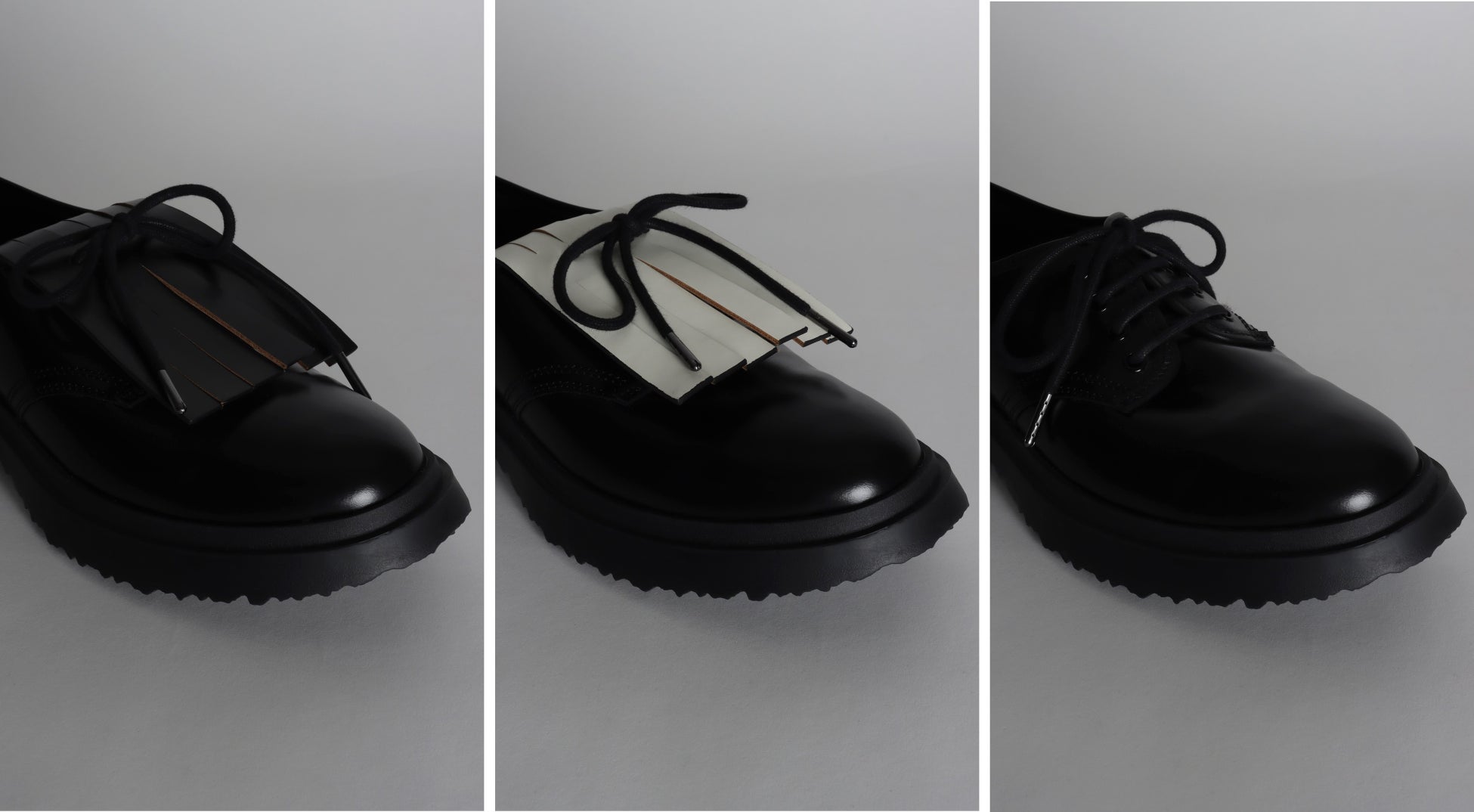 ポイントになるロングキルトはホワイトとブラックのリバーシブル仕様で、付け替えるだけでシューズの印象を一変させます。また、キルトは簡単に取り外しが可能で、シンプルなダービーシューズとしても着用できます。3WAY仕様で、気分に合わせて、アシンメトリーにもできます。シューレースも黒と白の2色をセットし、カラーコンビネーションを自由に楽しめます。