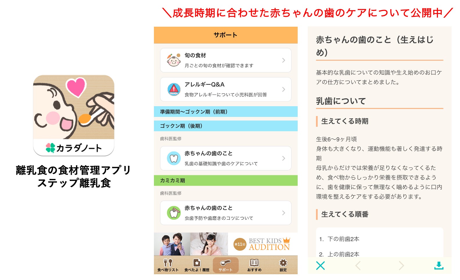 「家族の健康を支え笑顔をふやす」をビジョンとし、家族と向き合う全ての人のアシスタントとして心身ともに健康な生活を支援する事業会社である株式会社カラダノート(東京都港区/代表:佐藤竜也/以下当社)が開発・運営する、離乳食の食材管理アプリ「ステップ離乳食」にて新コンテンツ『赤ちゃんの歯のこと(歯科医監修)』をiOS・Androidの両OSにて公開したことをお知らせいたします。