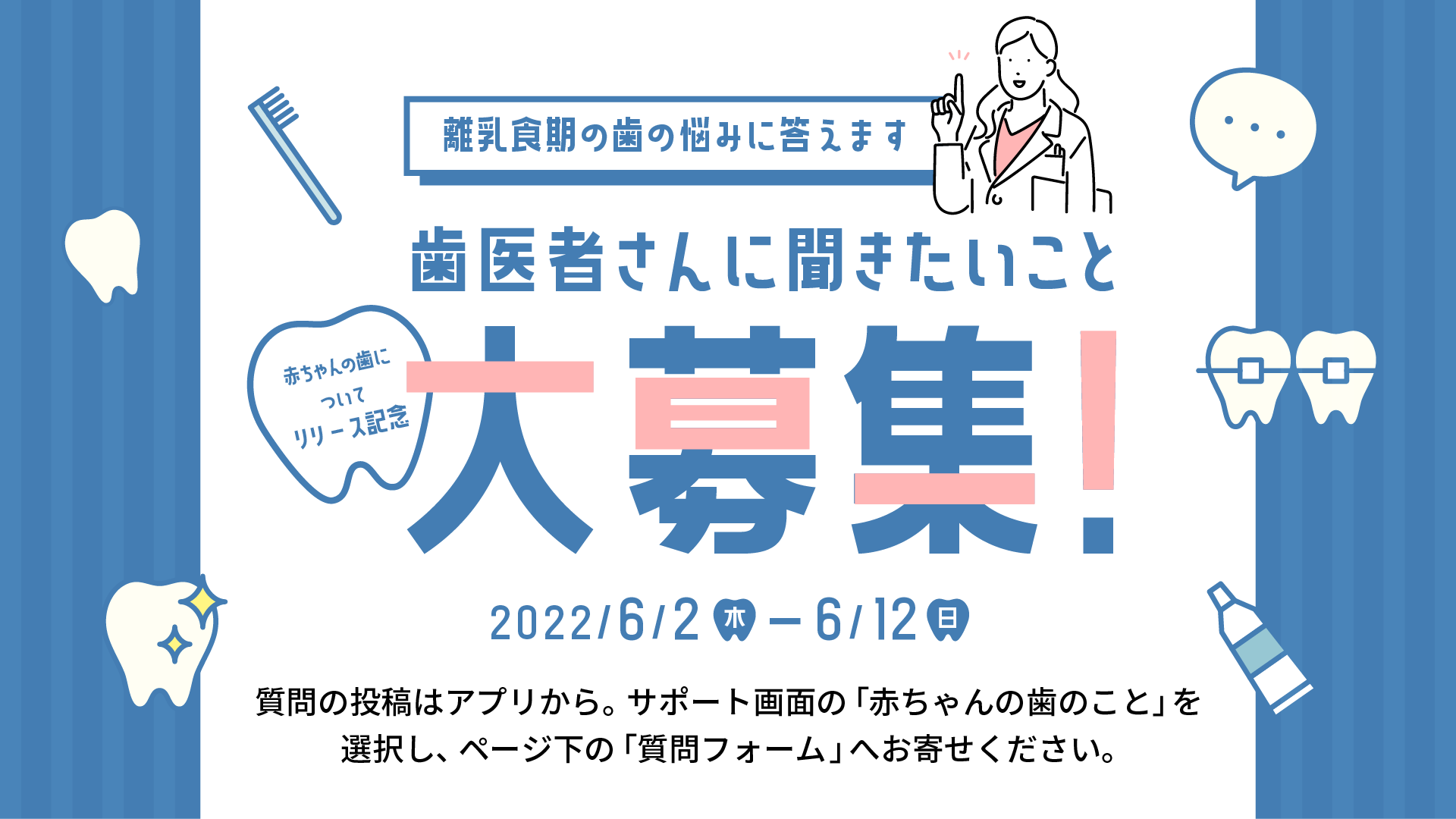また、コンテンツ公開を記念し、6月2日〜6月12日の期間中、歯科医へ質問したいことを募集しております。後日、当コンテンツ内でQ&A形式で公開予定です。