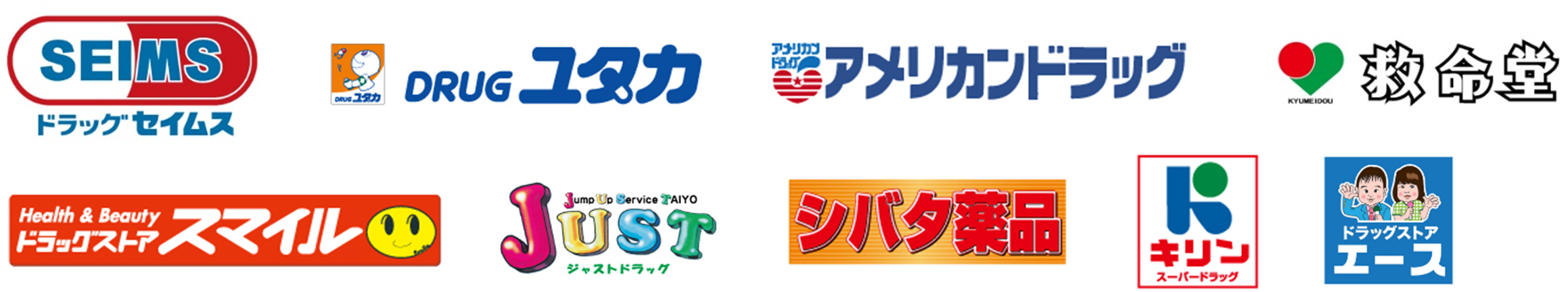 ドラッグ セイムス※、ドラッグユタカ、アメリカンドラッグ、救命堂、ドラッグストア スマイル、JUSTDRUG、シバタ薬品、スーパードラッグキリン、ドラッグストアエース(あみはま薬局)