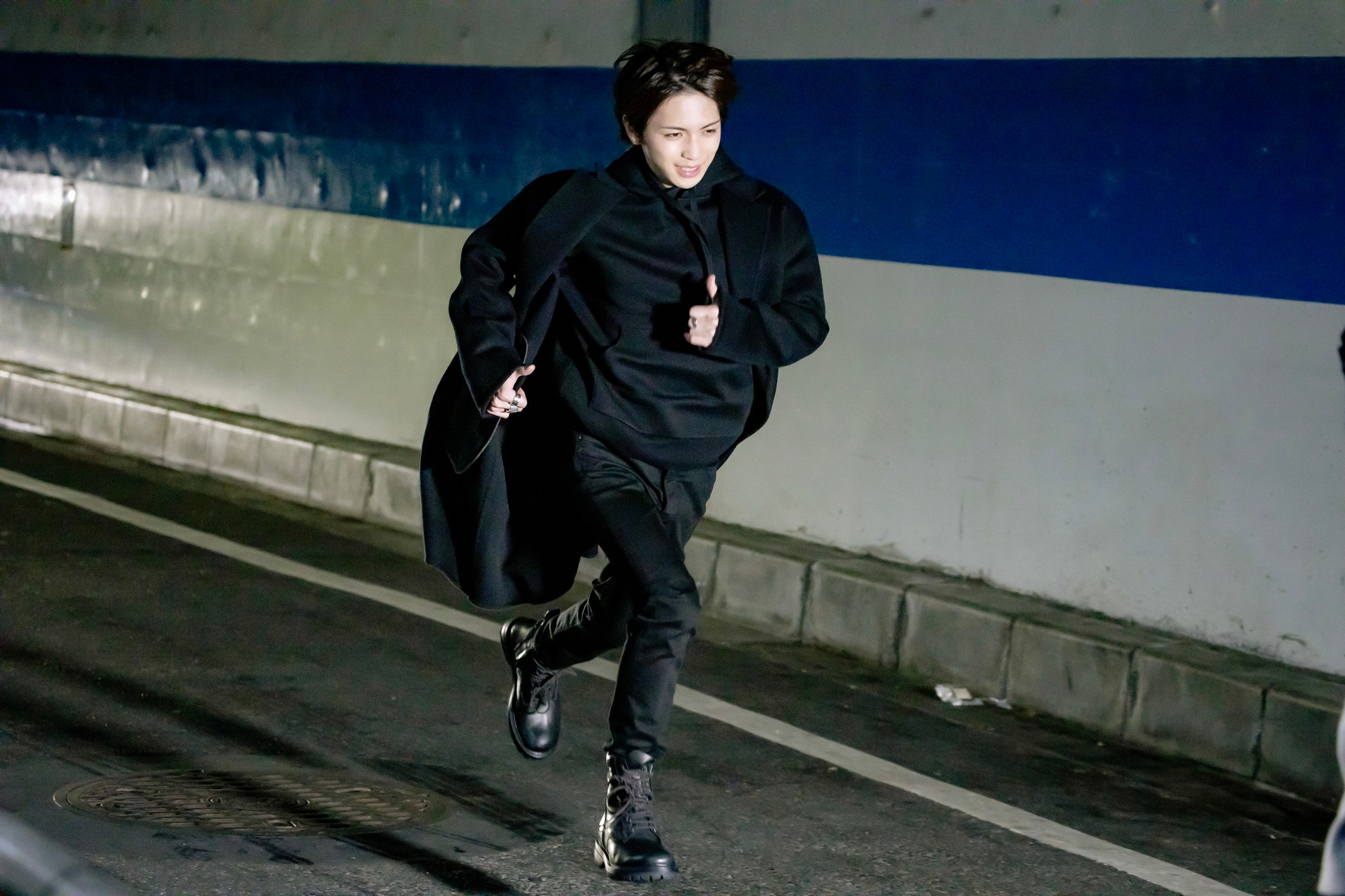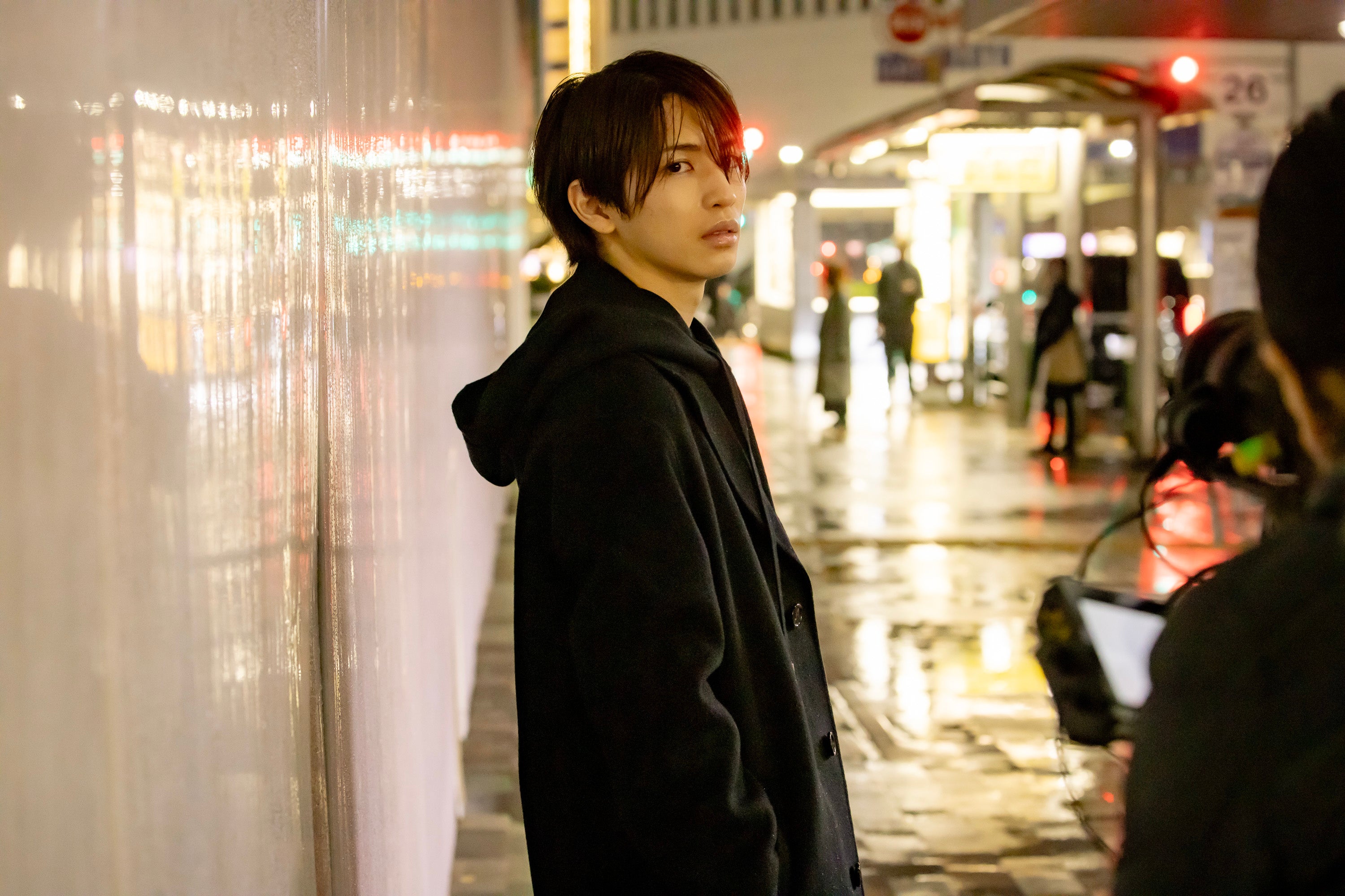 ネオン彩る街と暗闇に包まれた街の夜の二面性で展開される中、進行した撮影。一人歩く岩橋が、自分の中にみなぎる、前へ突き進むパワーに気づく瞬間を捉えた。