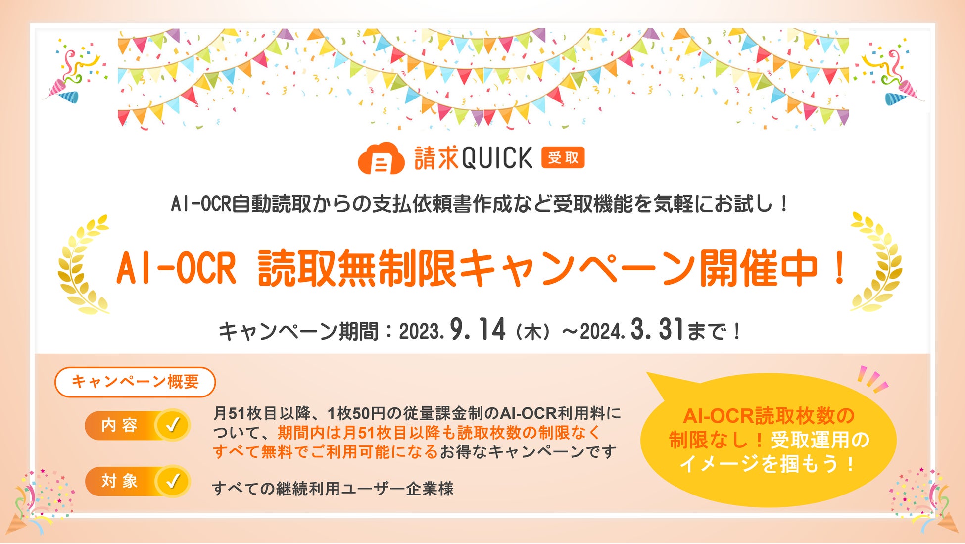 いよいよ10月1日にインボイス制度が開始となりましたが、当社ではAI-OCRの読取制限をなくすことで、料金を気にすることなく受取機能をお試しいただきたいとの思いから、継続利用ユーザー企業様向けに「AI-OCR読取無制限キャンペーン」を来年3月末まで開催中です。ぜひこの機会に、AI-OCRを使った自動読取からの支払依頼書作成を含め「請求QUICK」の受取機能をご利用ください。