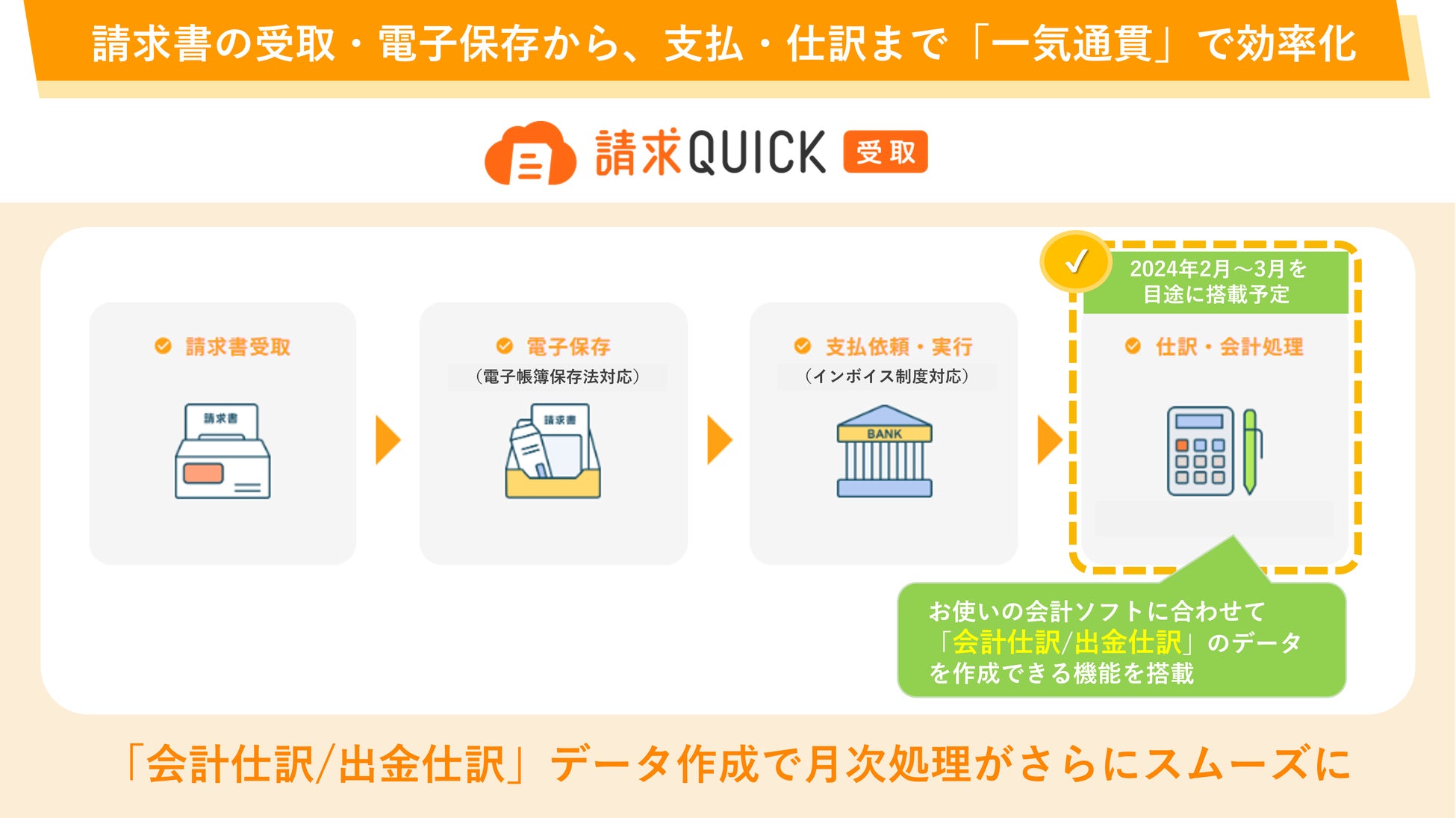 当社は、インボイス制度や改正電帳法への対応により、請求書関連業務に負荷が加わる中小企業の経理DXを後押しするために、請求書発行システムとして提供を開始した「請求QUICK」に請求書受取機能を実装し、「発行」「受取」「電子保存」の3つの機能をオールインワンで提供しています。「請求QUICK」の受取機能では、請求書の受取から電子保存・支払依頼書作成・承認・FBデータ作成までの各機能を提供していますが、会計ソフトへの連携まで一気通貫での効率化を実現するため、2024年2月~3月を目途に、「会計仕訳」および「出金仕訳」機能を搭載することといたしました。