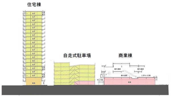 本事業は、JR三田駅と南側約1.9haの区域とをデッキで直結するほか、「にぎわい広場(仮称)」のある地上3階建の商業棟とその前面に地上20階建の住宅棟(集合住宅等)を一体で開発します。
