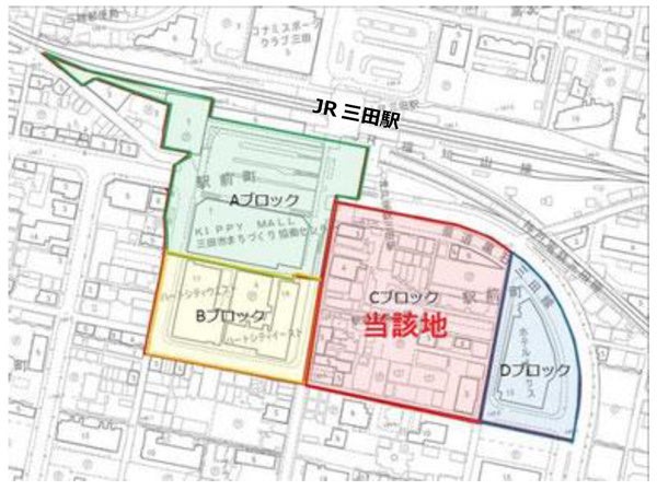 三田市では、1983年に策定された「三田駅前再開発構想」に基づき、三田駅前地区約5haをAからDの4ブロックに区分し、順次、市街地再開発事業を実施し、すでに、A、B、Dブロックが事業完了しています。