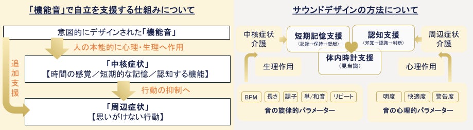 機能音とは、人の心理や生理に作用するようデザインされた音です。音が「中核症状」と「周辺症状」に働きかける仕組みを活用し、規則正しい生活を促す音を設計しました。この音は、高齢者の自立をサポートすることを目的としています。