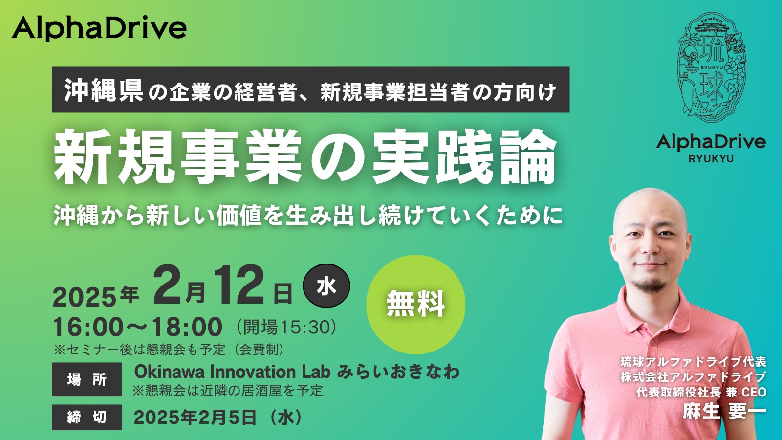 この度、新規事業開発の専門集団 株式会社アルファドライブ(以下、アルファドライブ)は、沖縄県内事業者の経営者および新規事業ご担当者向けに「新規事業の実践論」をテーマとしたセミナーを開催いたします。