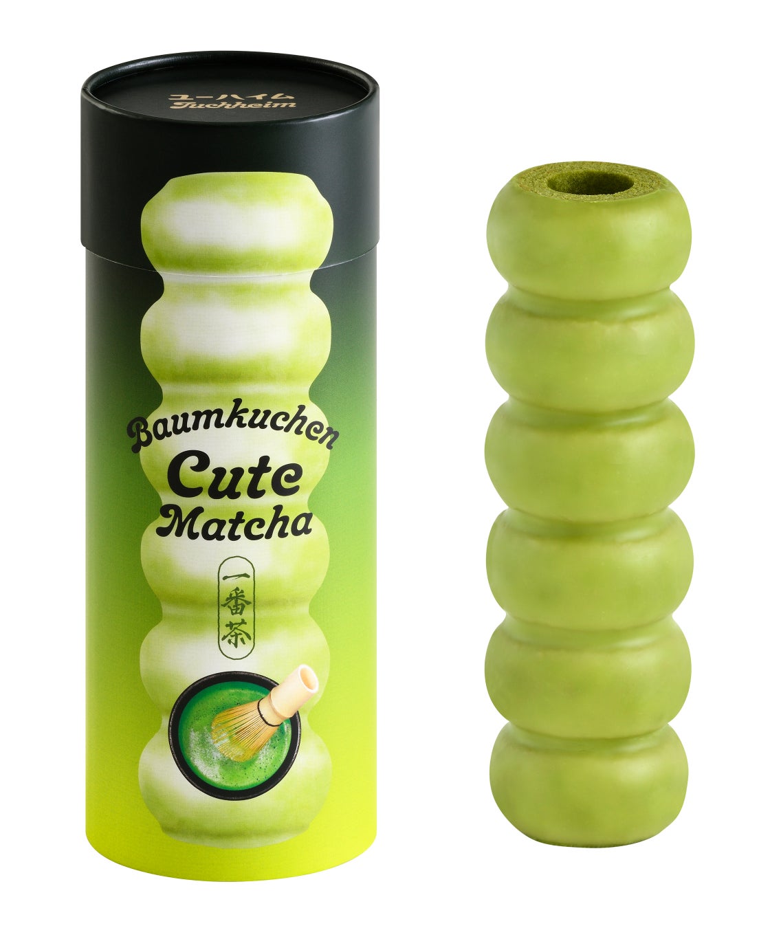 一番茶のまろやかさと旨みに、バウムクーヘン生地の発酵バターのコクと、外側のホワイトチョコレートコーチングのまろやかさが重なり増幅する組み合わせとなっており、通常のバウムクーヘンキュート(抹茶)とは一味違う、よりリッチな味わいを楽しめます。