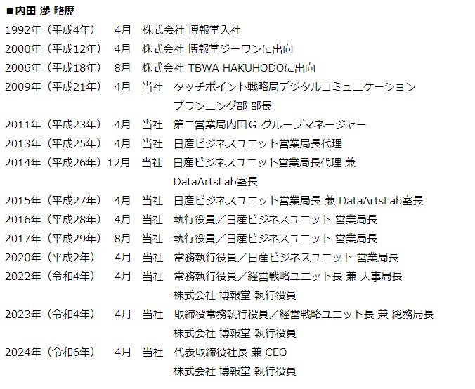 株式会社TBWA HAKUHODO(本社:東京都港区、代表取締役社長兼CEO:内田 渉、以下 TBWA HAKUHODO)は、2024年4月1日付にて新経営体制に移行し、新たに代表取締役社長兼CEOに内田 渉が就任したことをお知らせします。これに伴い、前代表取締役社長兼CEOの今井 明彦は社外取締役に就任しました。