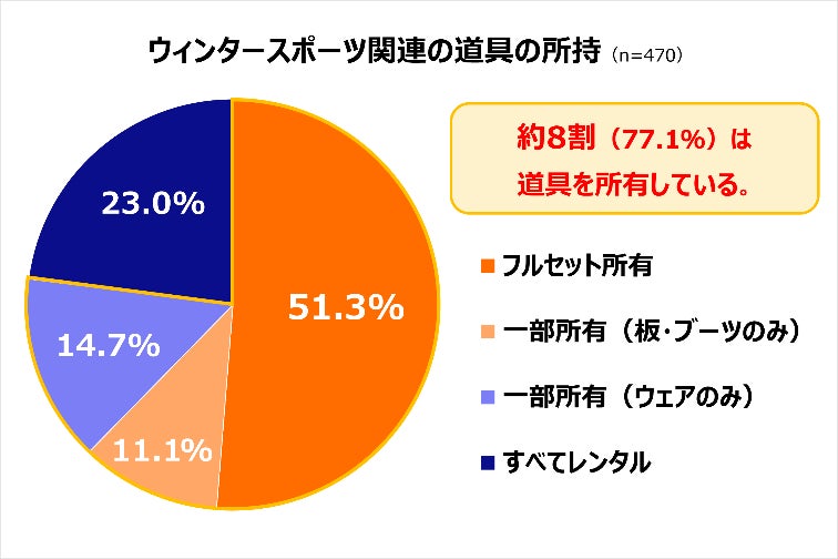 エリアリンク株式会社(本社:東京都千代田区、代表取締役:鈴木貴佳、以下、エリアリンク)は、日本最大級のレンタルトランクルーム「ハローストレージ」を運営しています。この度、直近3年以内にウィンタースポーツ(スキー・スノーボード)を行ったことがある20~60代の男女470名を対象に、道具の所有と収納に関するアンケート調査を実施しました 。本レターでは、オフシーズン中の大型道具の収納場所に関する課題や、収納場所を確保することによって「趣味の満足度」をいかに向上させるかなど、場所の制約と趣味の充実に関する調査結果をご紹介します。
