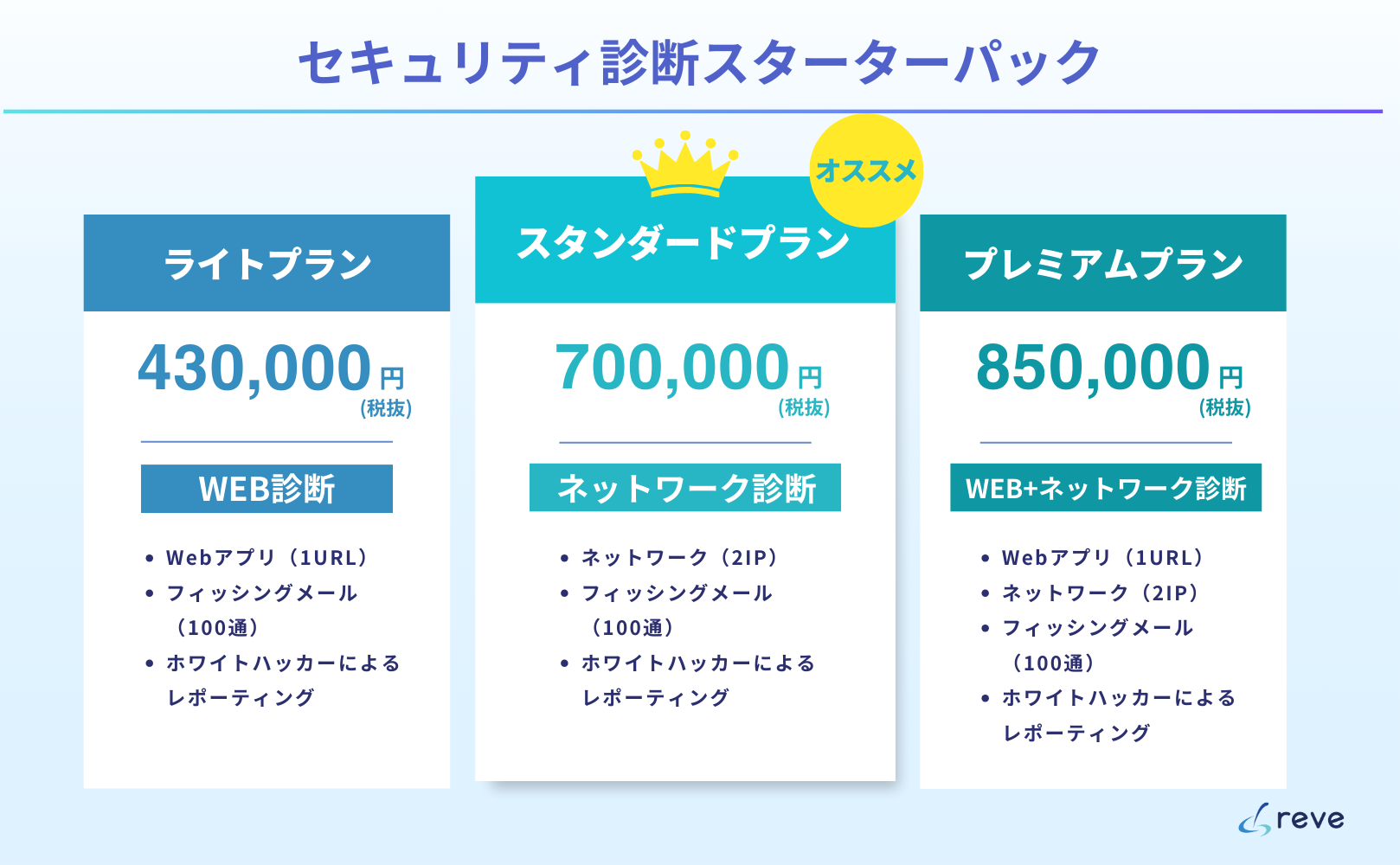「セキュリティ診断スターターパック」では、 企業の規模や目的に応じて選択できる 3つのパッケージプラン を用意しています。 いずれのプランも、診断条件を明確にしたパッケージ設計とすることで、 導入前に費用感を把握しやすく、安心して検討できる内容となっています。