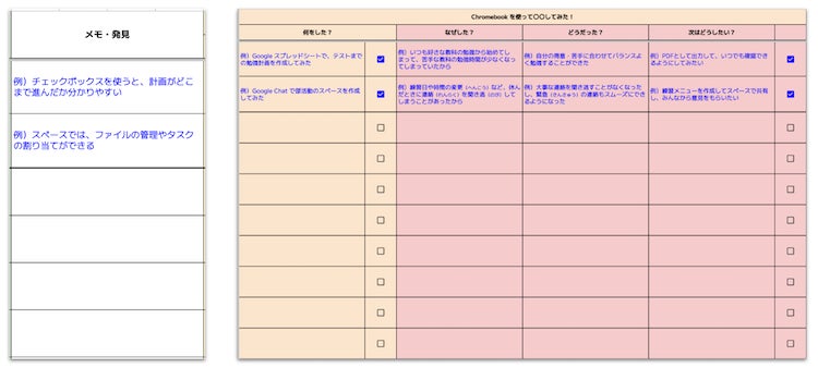 「活用表 バージョン2」の中には、子どもたちが活用表に取り組む中で初めて知ったことや覚えたこと、自ら発見した機能や活用アイデアを記載する項目があり、自分の言葉で書き留めていくことで一人一人オリジナルの活用表が完成されていきます。