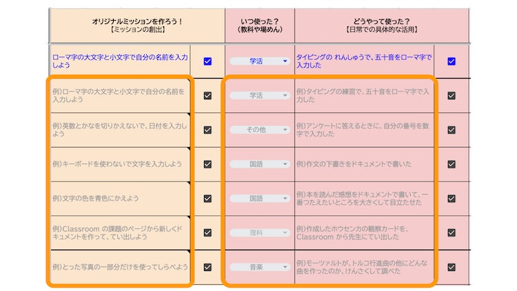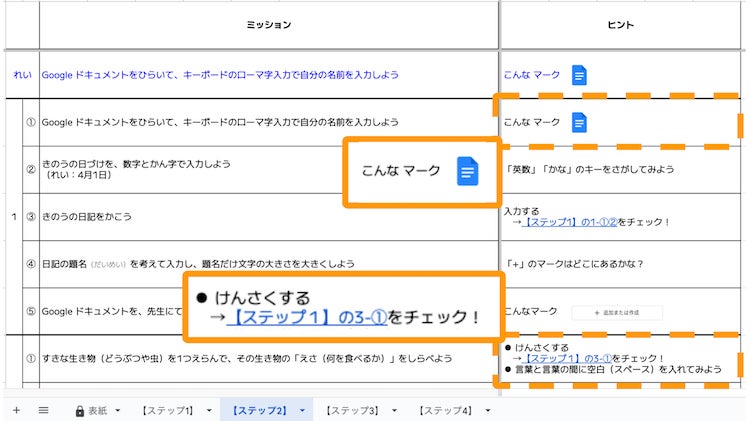 各ステップで情報活用能力を育むための活動(=ミッション)が設定されており、ミッションごとにクリアするためのヒントが記載されています。全てのステップが同じ Google スプレッドシート™ のファイルに集約されているため、ステップ1からじっくり進めてみたり、困ったときにはヒントを参照して前のステップに戻ったりと、子どもたちが自分に合ったステップを選択し、それぞれのペースで取り組むことが可能です。