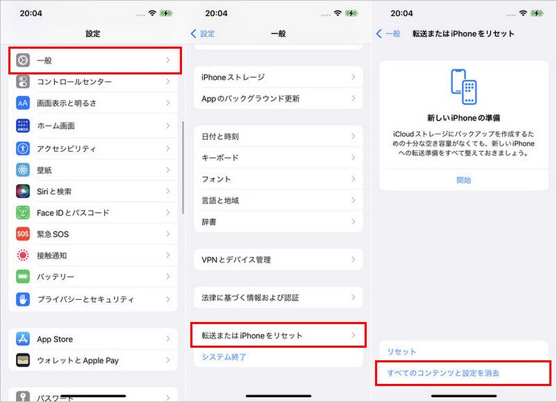 - 「すべてのコンテンツと設定を消去」をタップします。