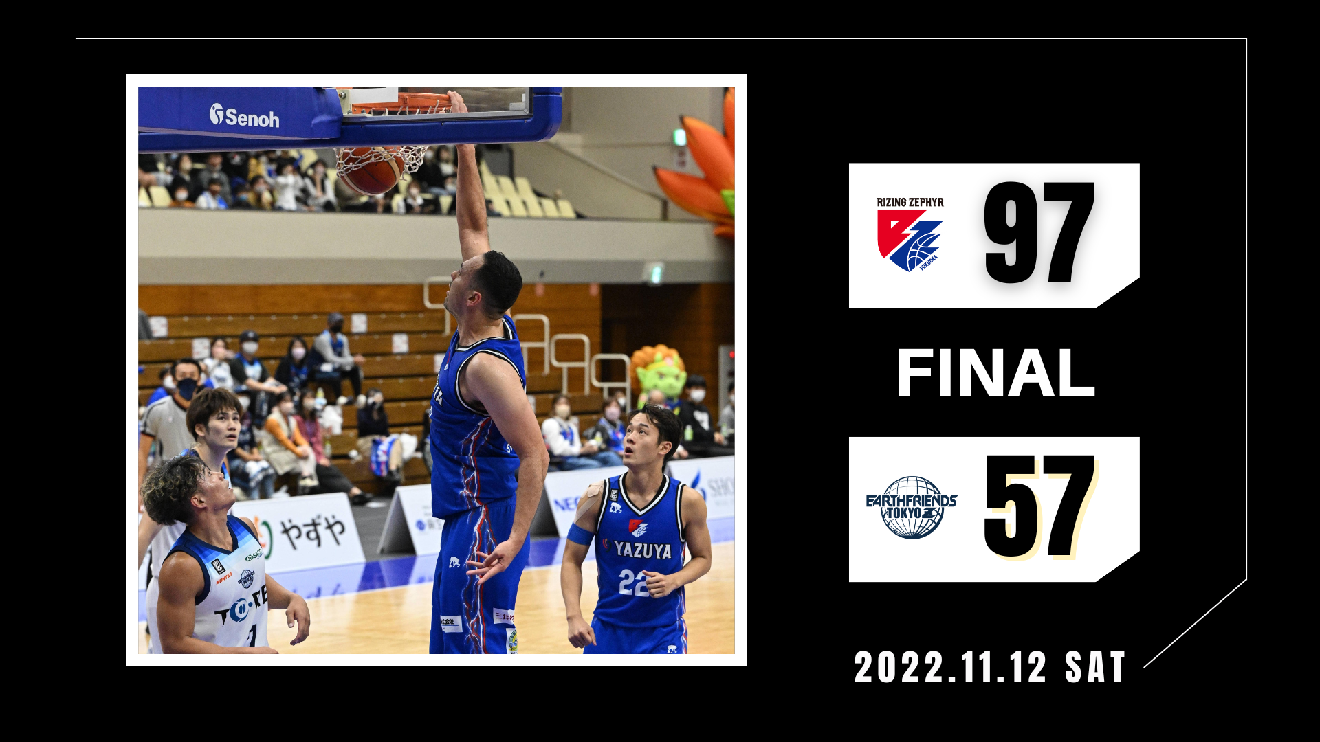 2022年11月12日(土)に開催されましたBリーグ第7節【ライジングゼファーフクオカvs.アースフレンズ東京Z】において“福岡97-57東京Z”の結果となりましたことお知らせいたします。