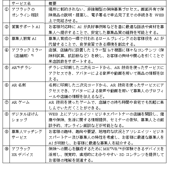 | ⑥ | AR名刺 | 名刺に印刷した二次元コードから、AR技術を使ったサービスにアクセスでき、アバターによる音声や動画を用いて募集人のプロフィールや店舗の情報を伝えるなど。 |